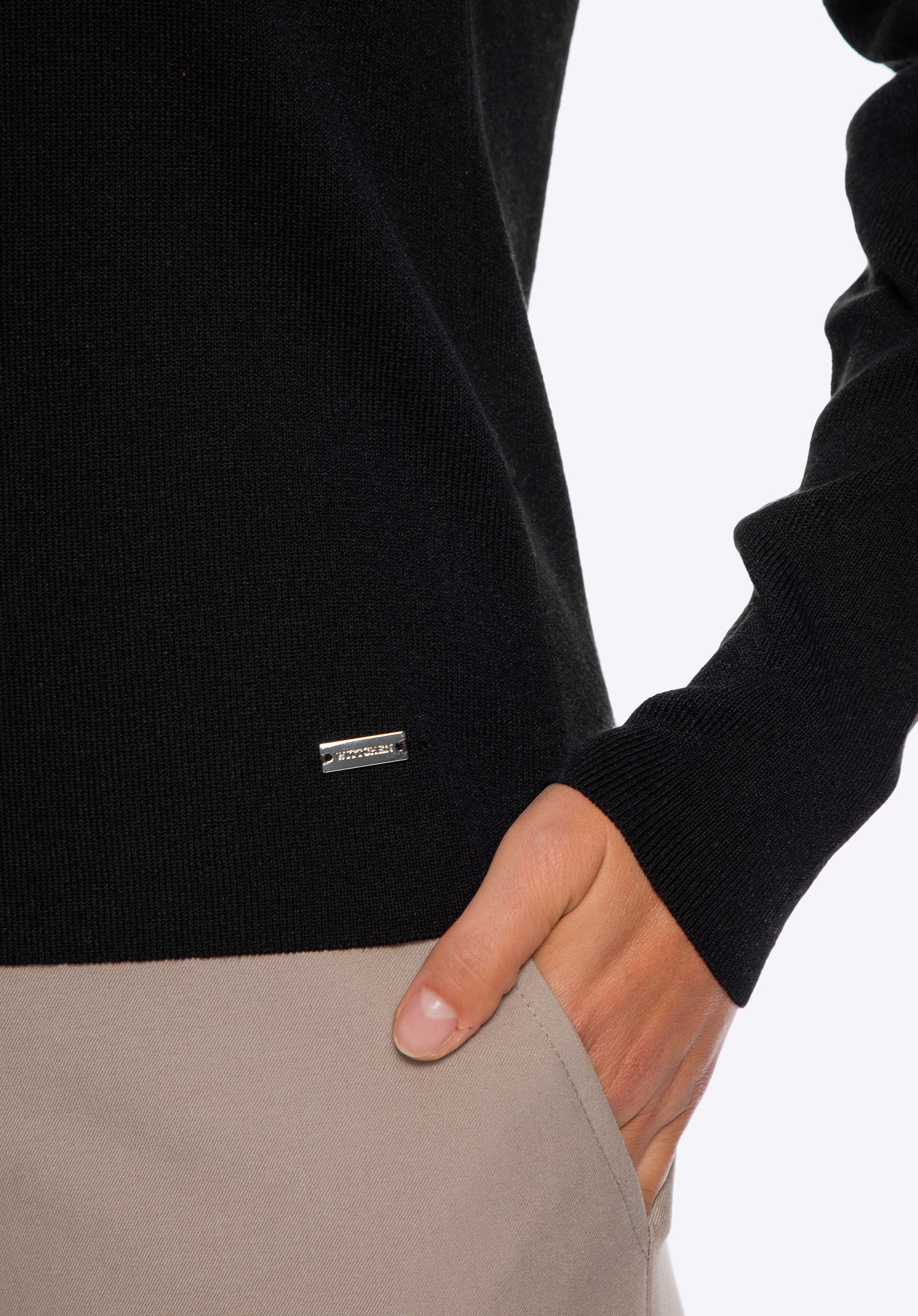 Tento svetr je perfektní volbou, pokud hledáte pohodlí v kombinaci s klasickou elegancí. Je vyroben z měkké a lehké viskózy smíchané s nylonem a nabízí celodenní pohodlí bez ohledu na příležitost. Dlouhé, přiléhavé rukávy jsou navrženy tak, aby úhledně přiléhaly k zápěstím, a zajišťují tak lichotivý střih a elegantní vzhled. Žebrovaný výstřih dodává svetru jemnou strukturu a sofistikovanost. Kovový detail na lemu je moderním akcentem, který zdůrazňuje péči věnovanou zpracování každého prvku a dodává mu moderní nádech.