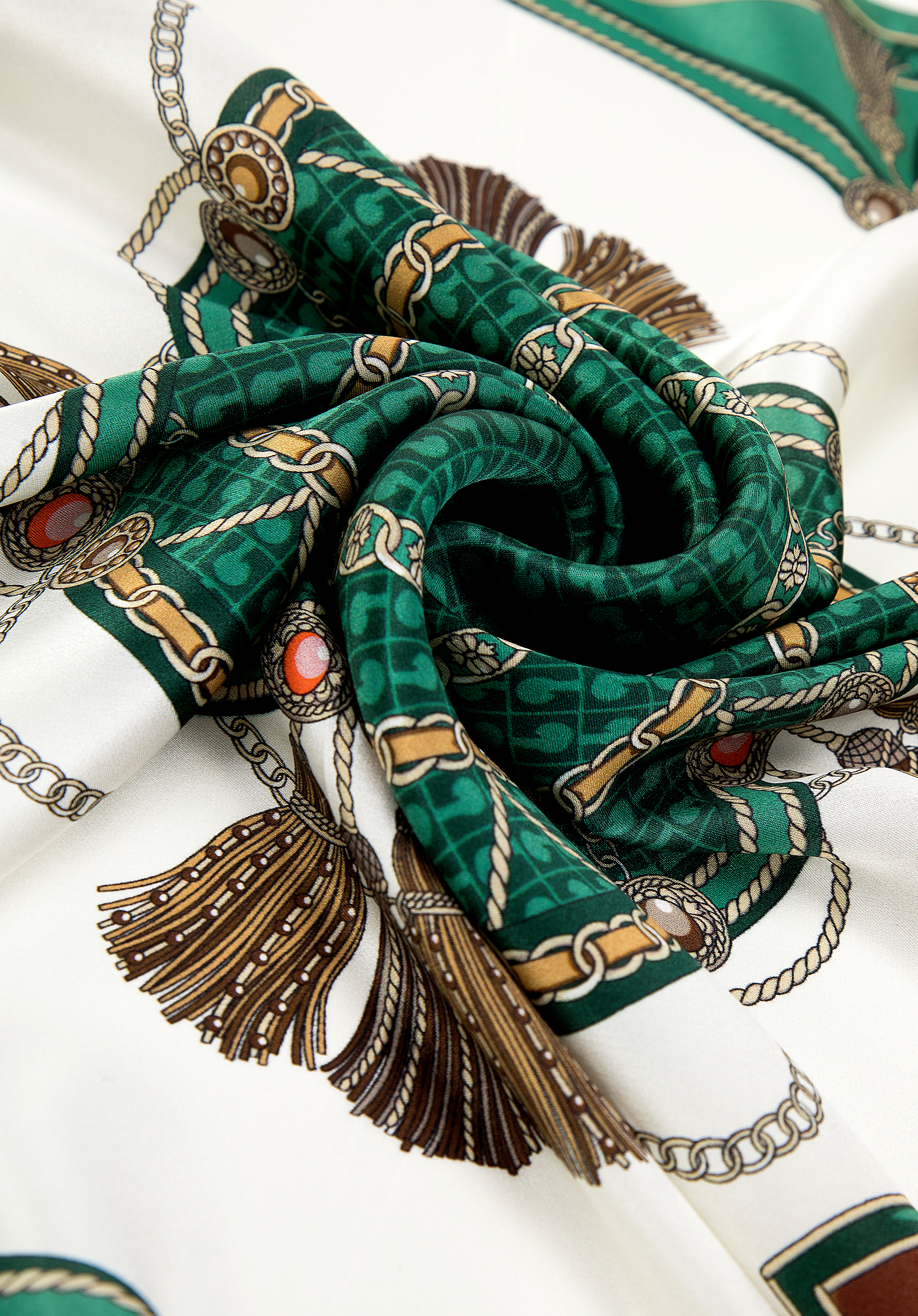 Elegantní hedvábný šátek s klasickým, aristokratickým motivem je doplňkem, který zaujme svým jedinečným tvarem a luxusním charakterem. Je vyroben z nejkvalitnějšího hedvábí, zaujme svým jemným leskem a jemností zajišťující pohodlí při nošení. Je zdoben symetrickým vzorem a ornamenty. Bude módním akcentem jakéhokoliv stylu. Perfektní pro každodenní nošení, do práce nebo pro zvláštní příležitosti jako jemný detail podtrhující váš jedinečný vkus.