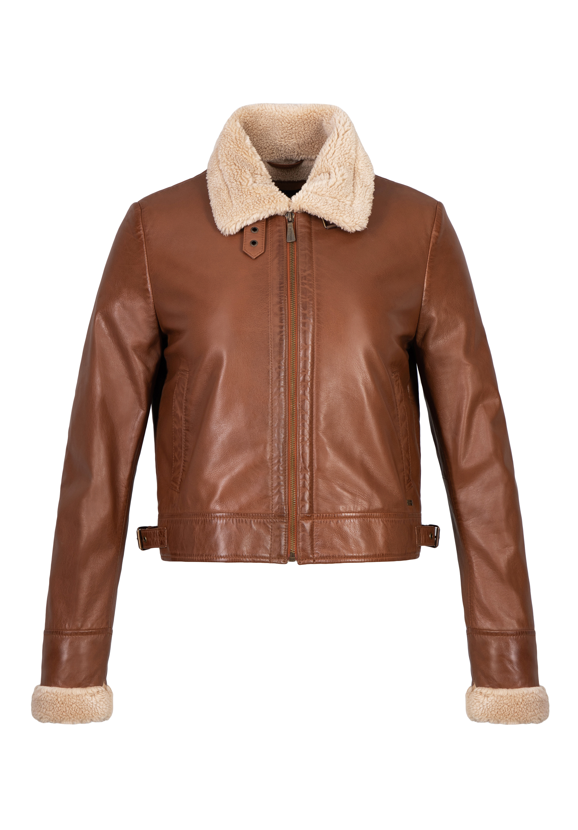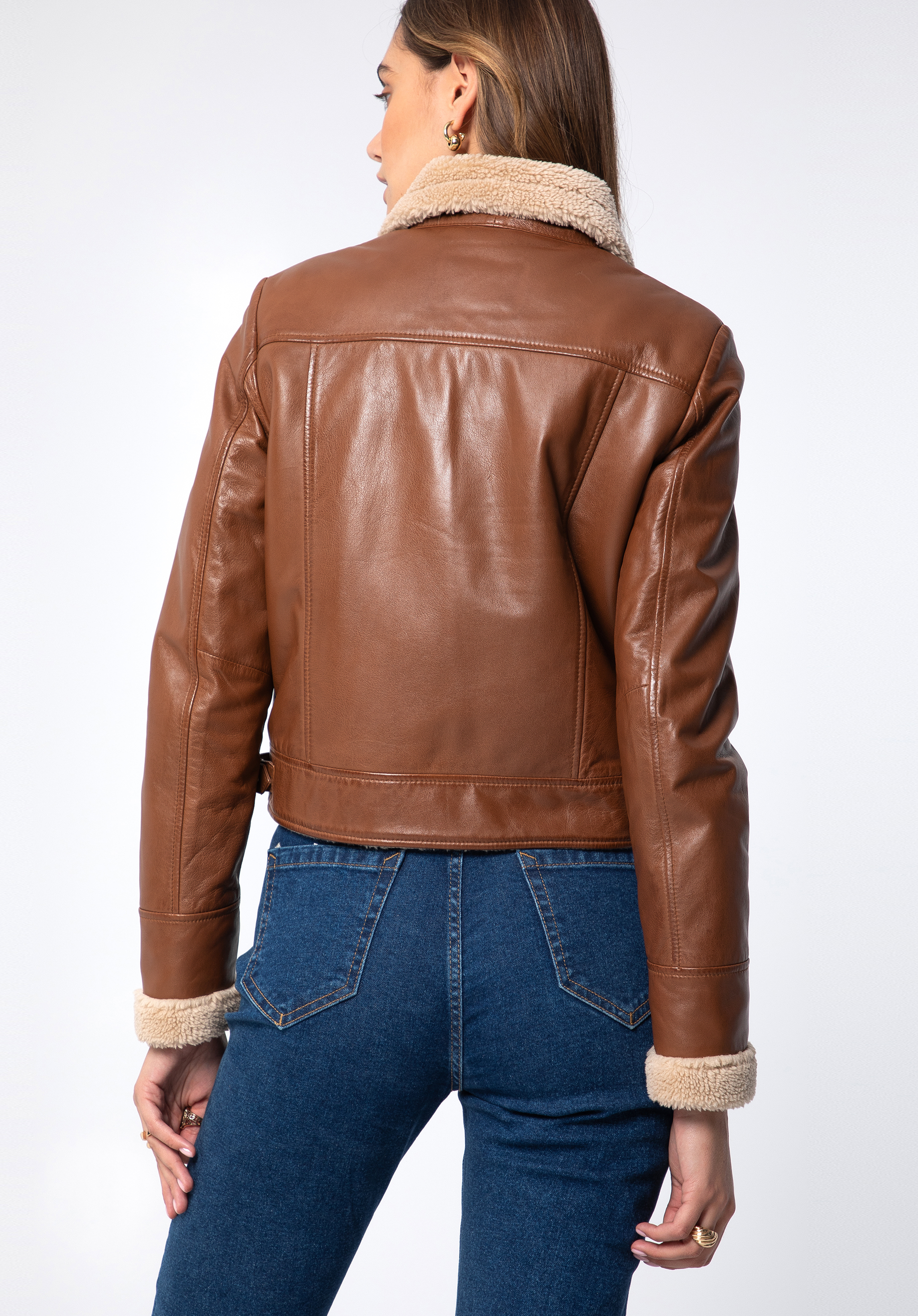 Tato dámská bunda je originálním doplňkem, který stojí za to mít ve svém šatníku. Je vyrobena z vysoce kvalitní přírodní kůže. Podšívka z ekologické kožešiny je velmi příjemná na dotek. Celek doplňují boční kapsy, kam si můžete v chladnějších dnech dat ruce. Jeho šířku můžete upravit pomocí bočních přezek. Límec můžete zvednout a zapnout páskem s přezkou, který ochrání váš krk před chladem. Noste ji se svými oblíbenými obleky – budete vypadat stylově za každé situace. Krátká dámská kožená bunda podšitá ekologickou kožešinou bude se hodit na podzim a na jaře.