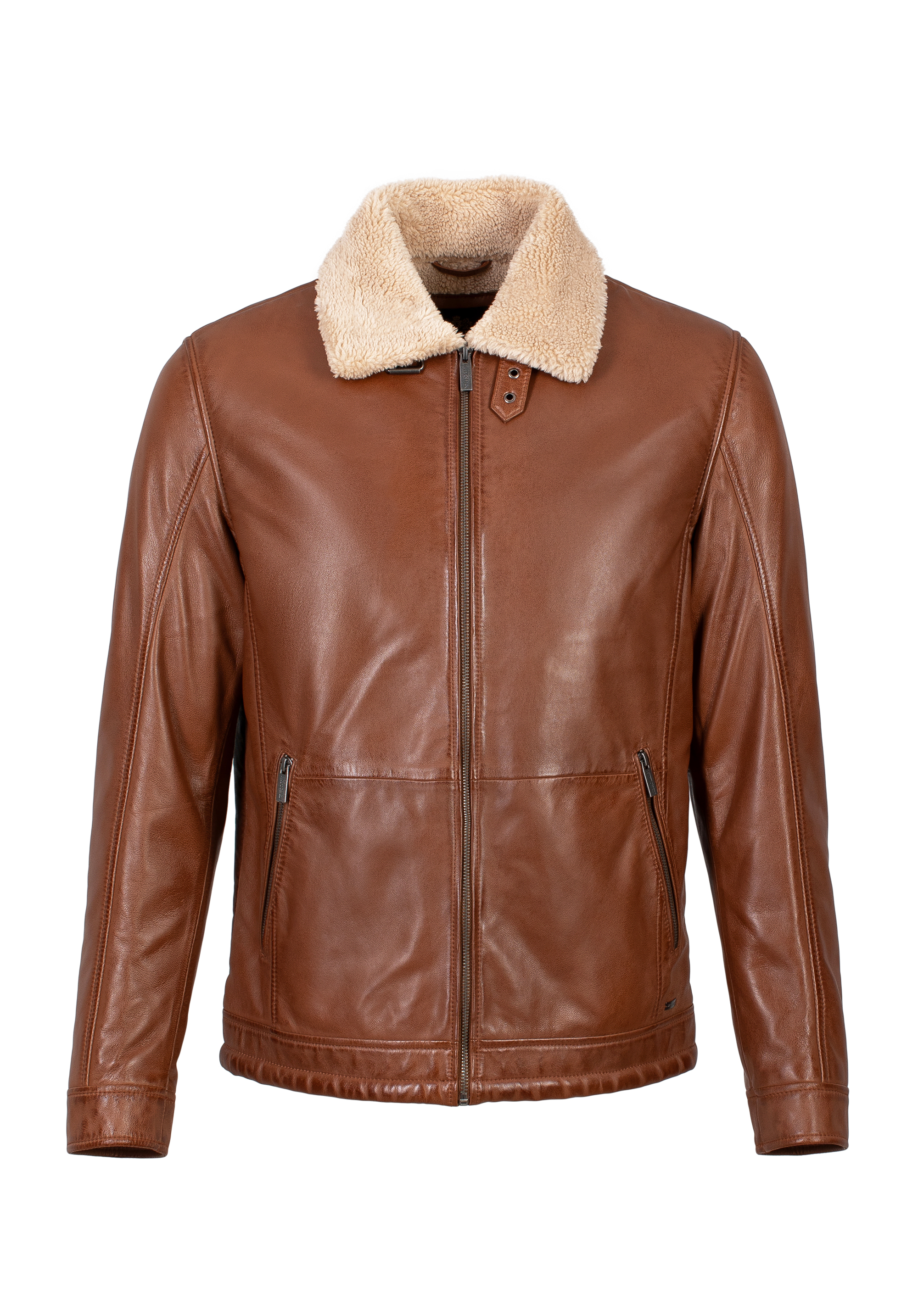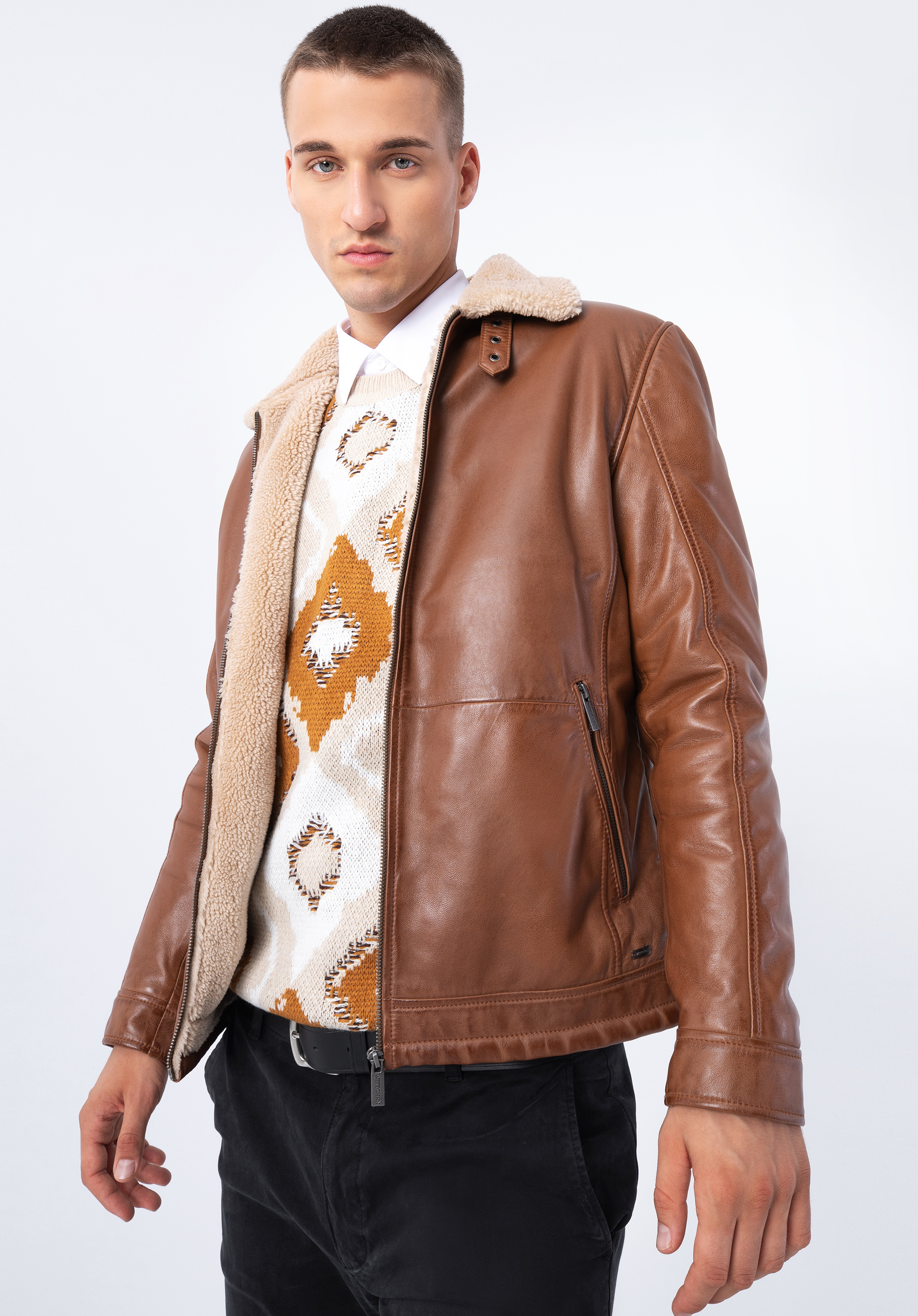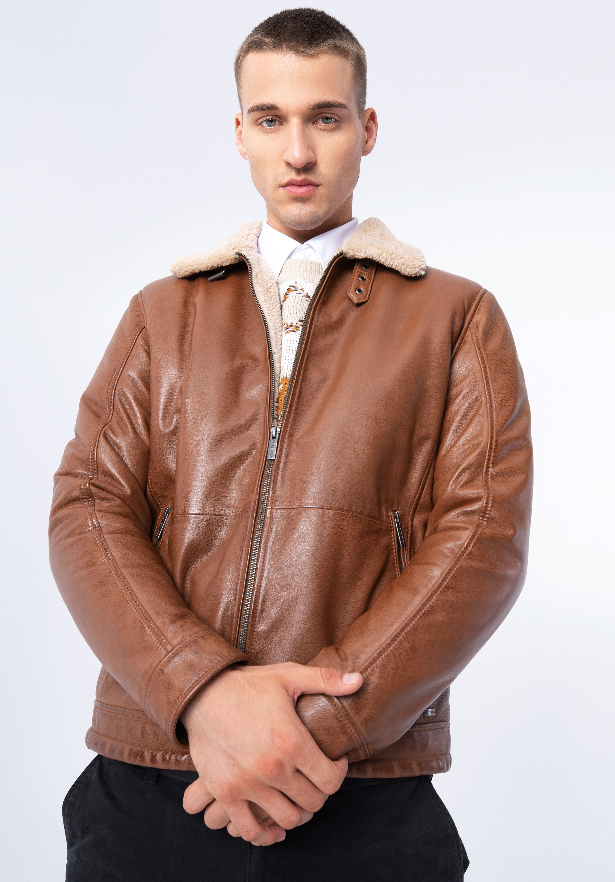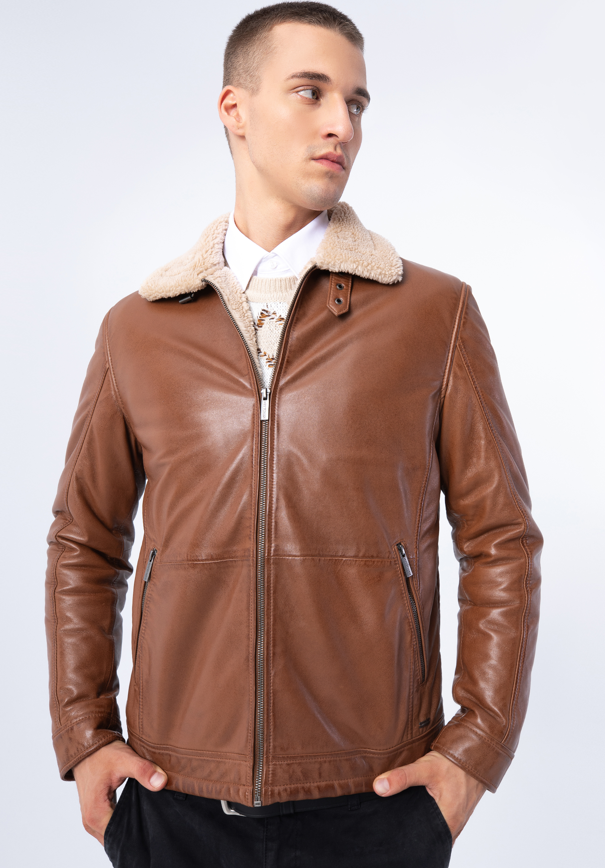 Tato stylová bunda bude módním doplňkem každého muže. Je vyrobena z měkké přírodní kůže a podšitá ekologickou kožešinou, kterou najdeme i na rolovacím límci. Límec můžete otočit a zapnout páskem s přezkou, čímž vytvoříte široký stojáček. Po stranách jsou dvě vertikální kapsy na zip. Pánská kožená bunda z ekologickou kožešinou je vhodná na podzim, lehkou zimu a jaro.