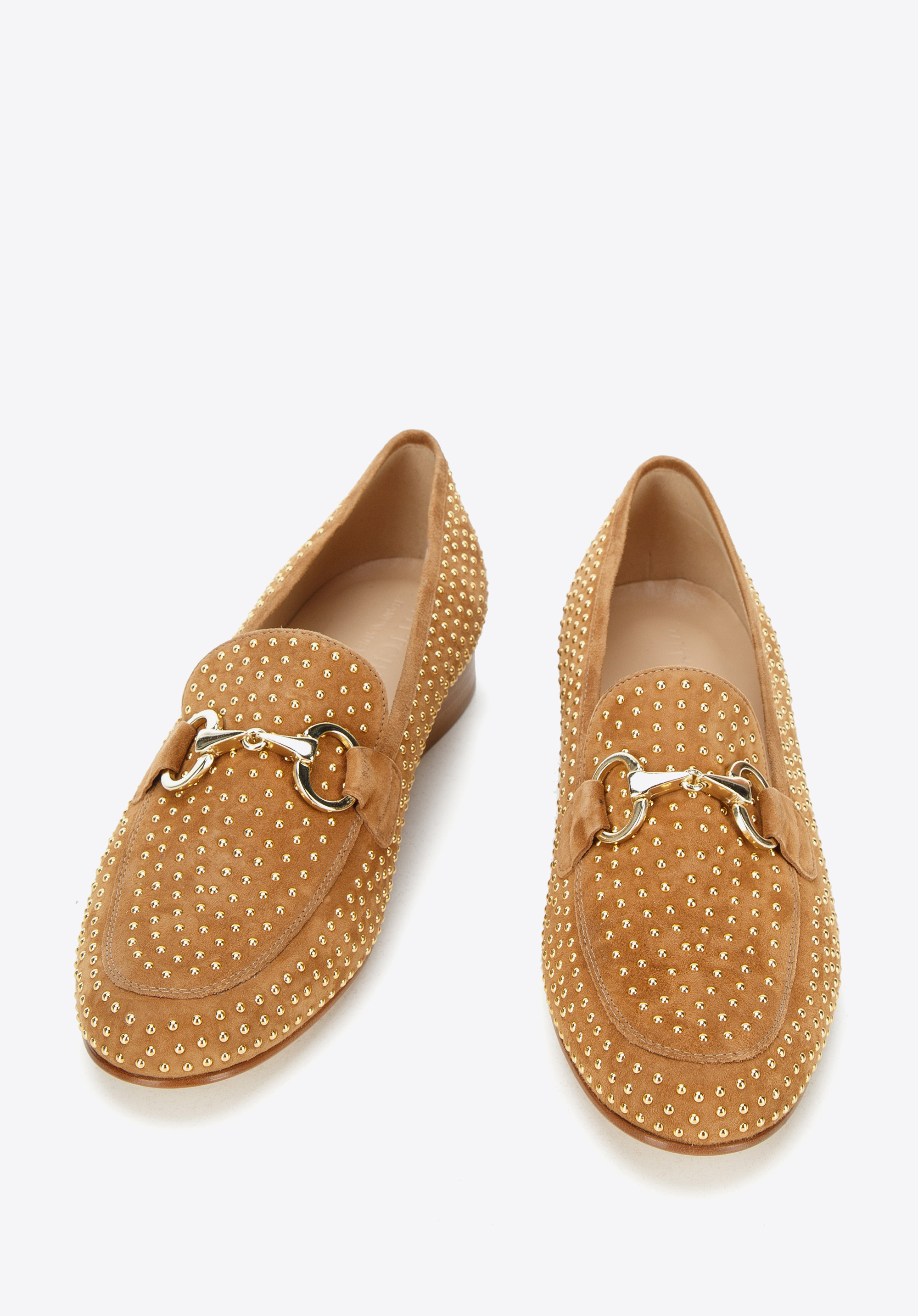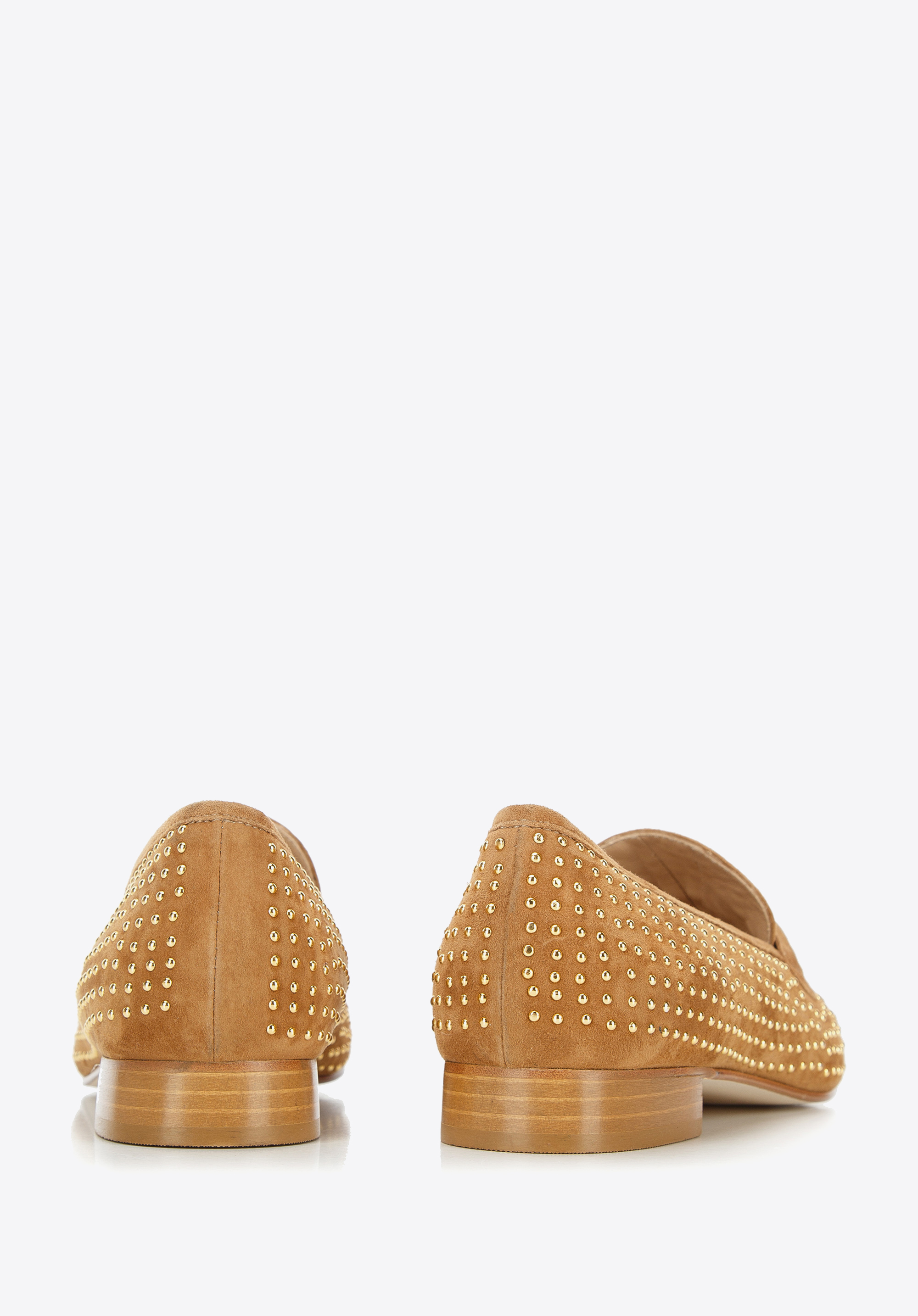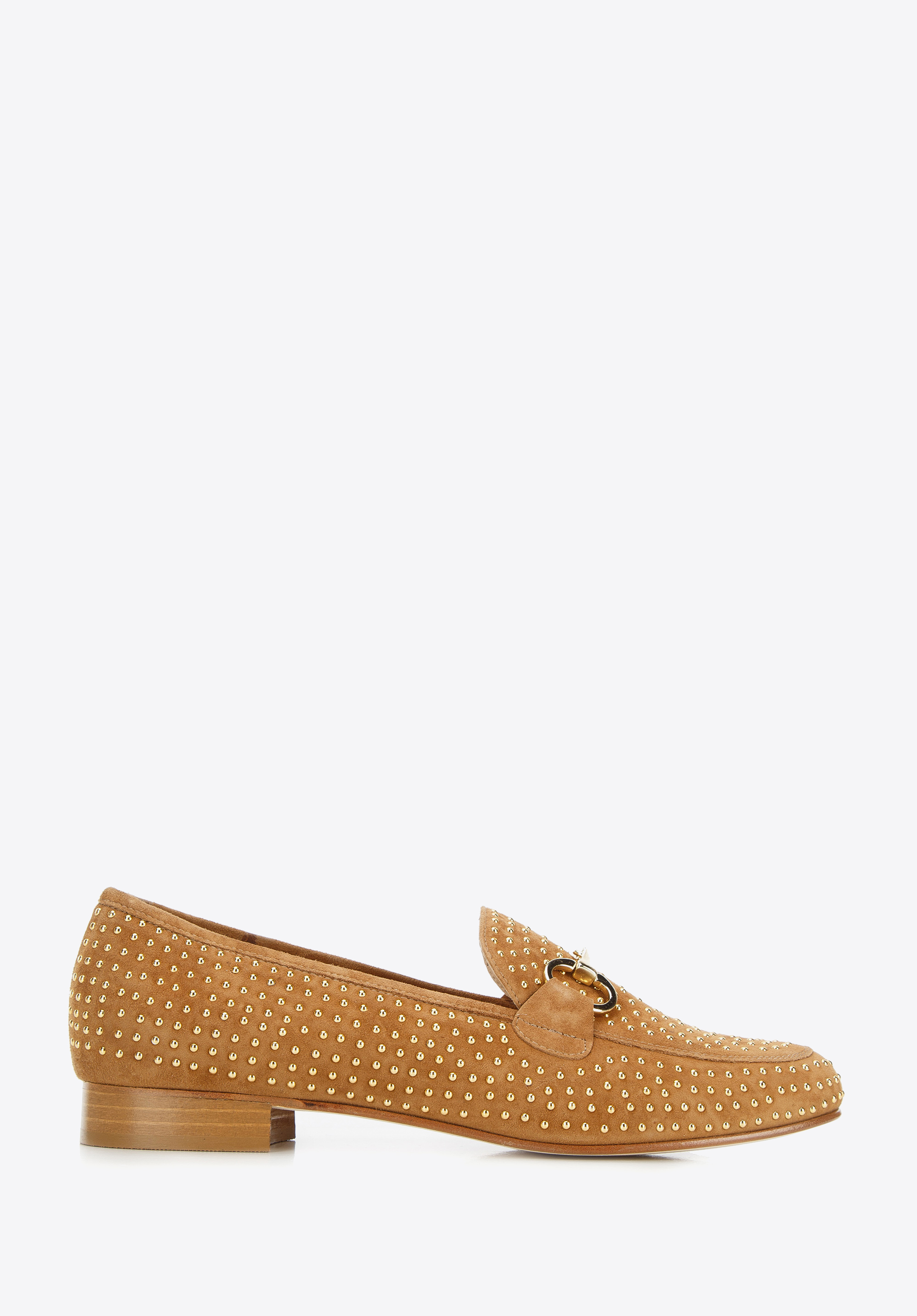 Tyto dámské boty potěší každou zenu. Jsou vyrobeny z nejkvalitnějšího přírodního semiše, který nošením získává krásu. Mají klasicky styl mokasín - s přezkou. Mají štíhlou linii, která krásně odhaluje nohu a kotník. Semišové mokasíny můžete nosit například k úzkým kalhotám s rozepnutým kotníkem nebo elegantním šatům. Dámské semišové mokasíny s nýty jsou nadčasovým doplňkem, který kombinuje klasický styl s originálními dekoracemi.