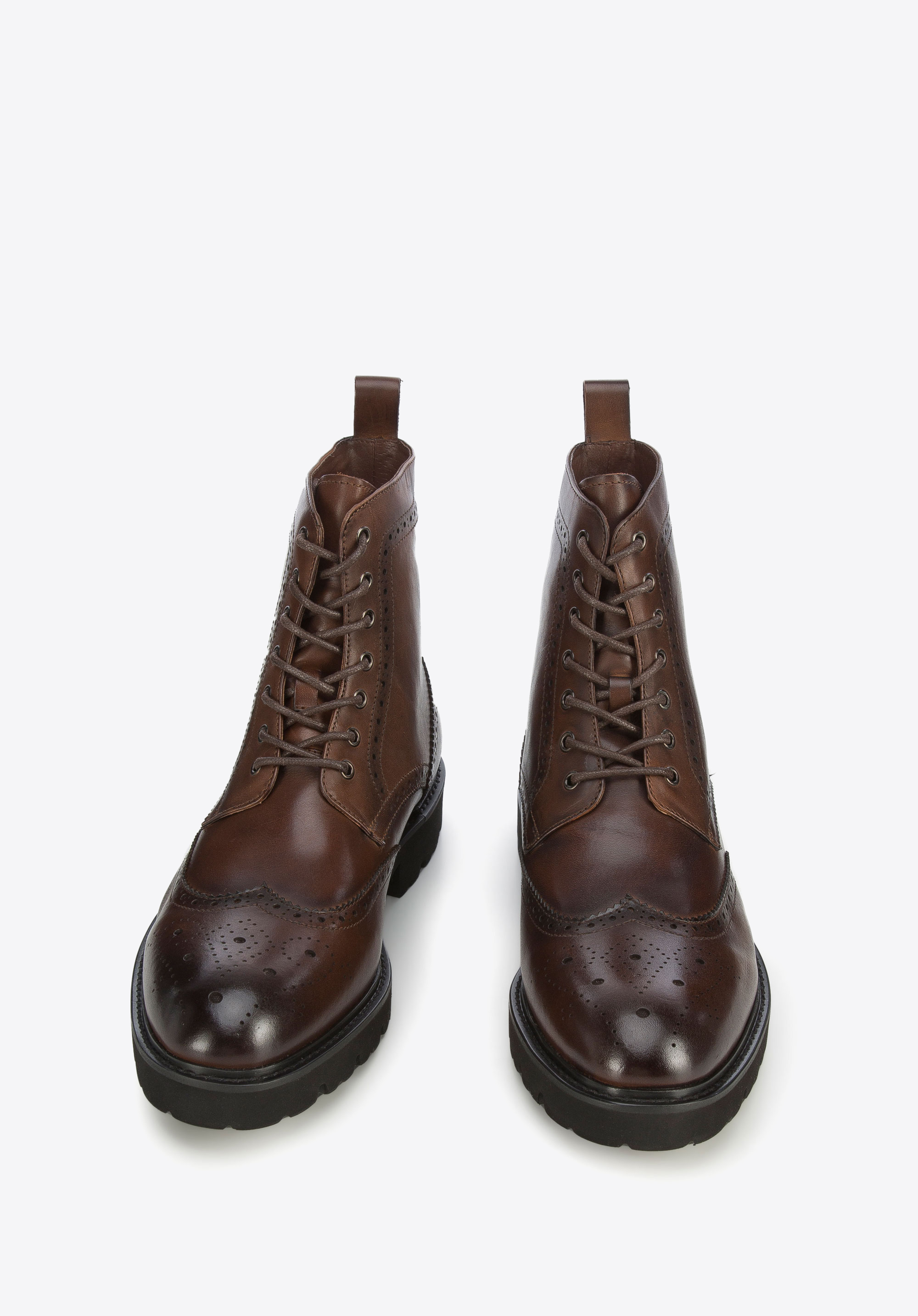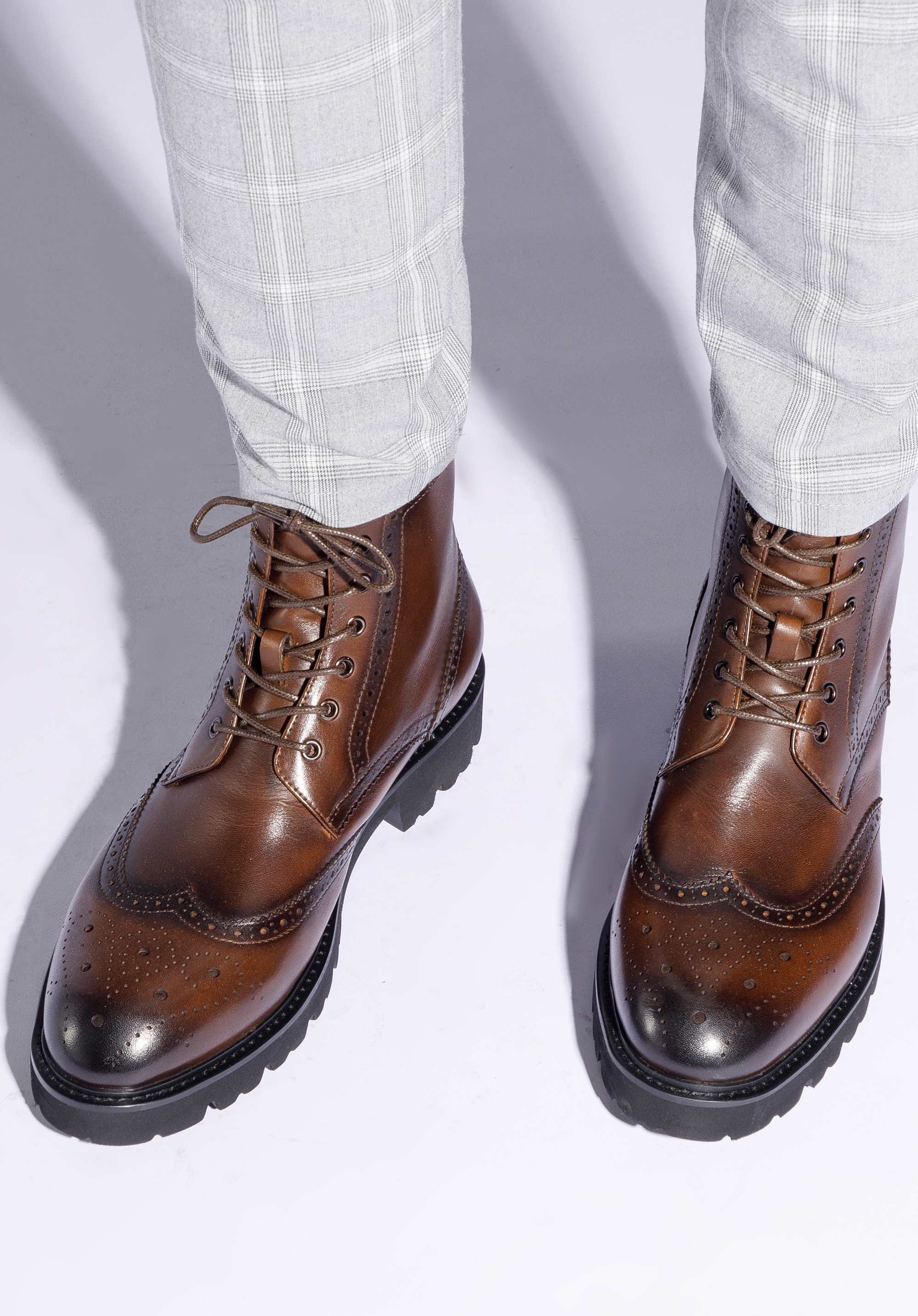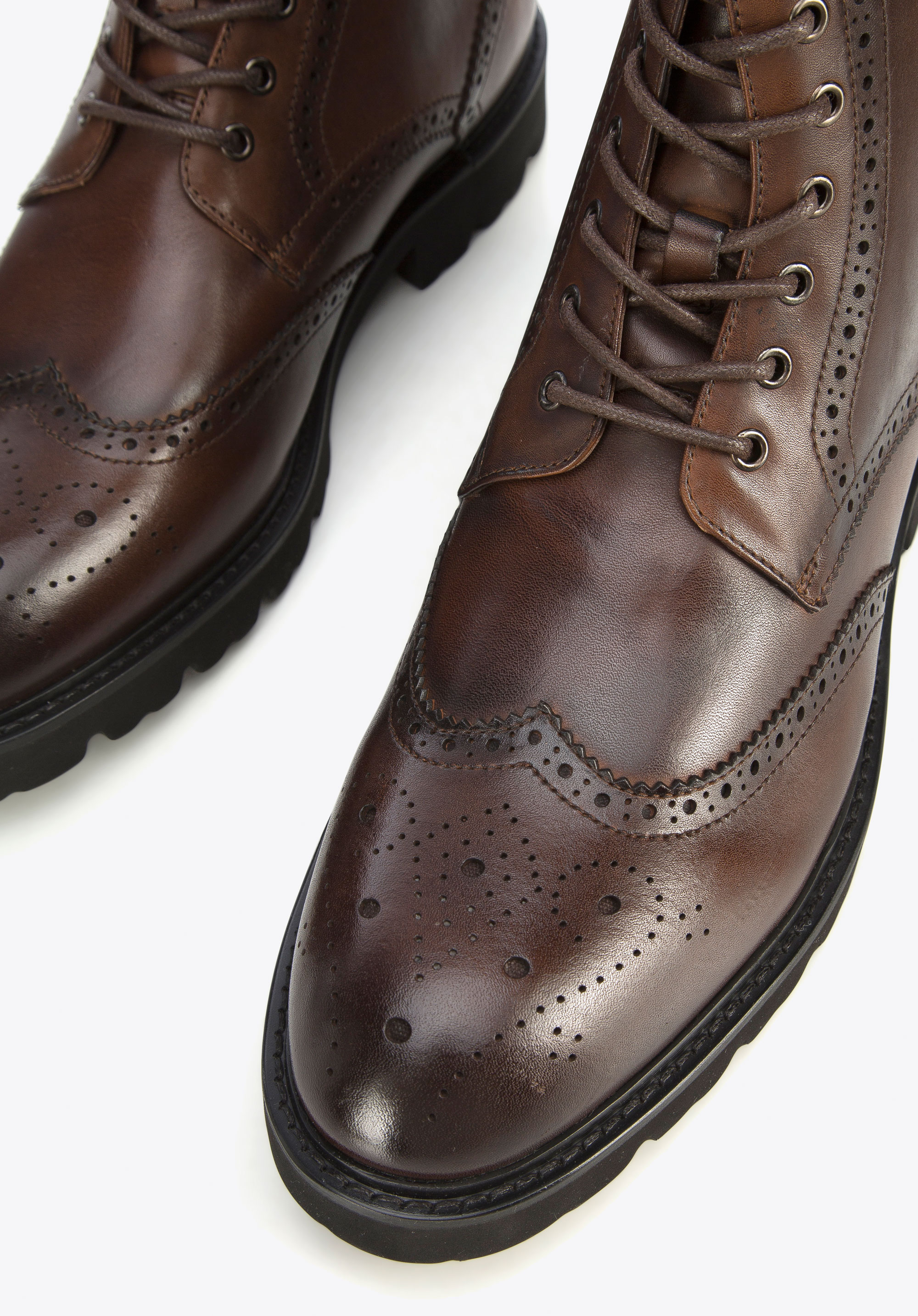 Tyto stylové pánské boty mají klasicky střih. Jsou vyrobeny z kvalitní přírodní kůže. Díky silné podrážce s výrazným nášlapem můžete v nich pohodlně hodit za každého počasí při zachování elegantního stylu. Mají další zesílení na patě a špičce. tyto boty budou vám sloužit mnoho let. Jedná se o skvělý model jak k džínům, tak k obleku s košilí. Pánské kožené boty s ozdobnou perforací jsou jedinečným doplňkem vašeho šatníku na podzim a zimu.