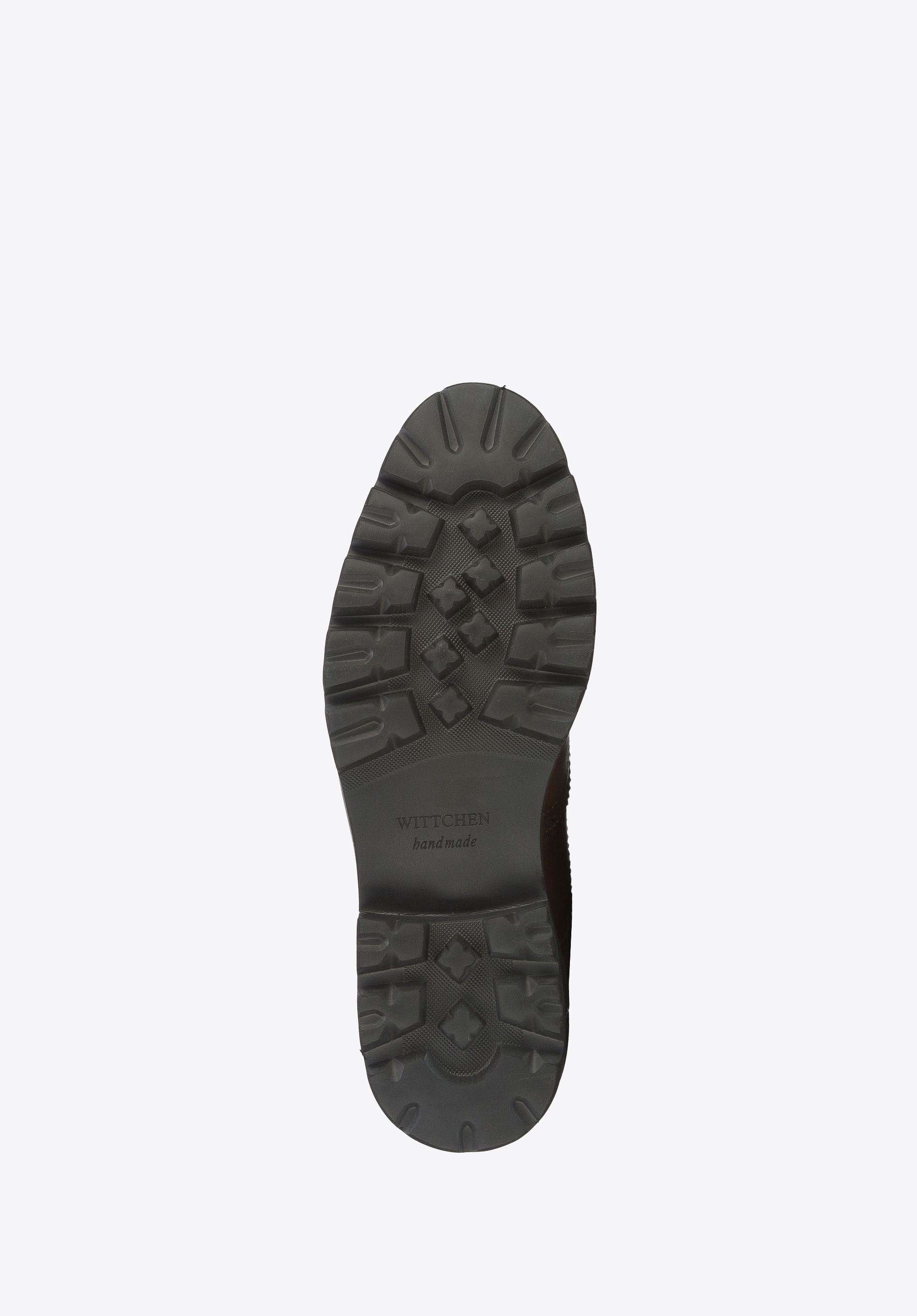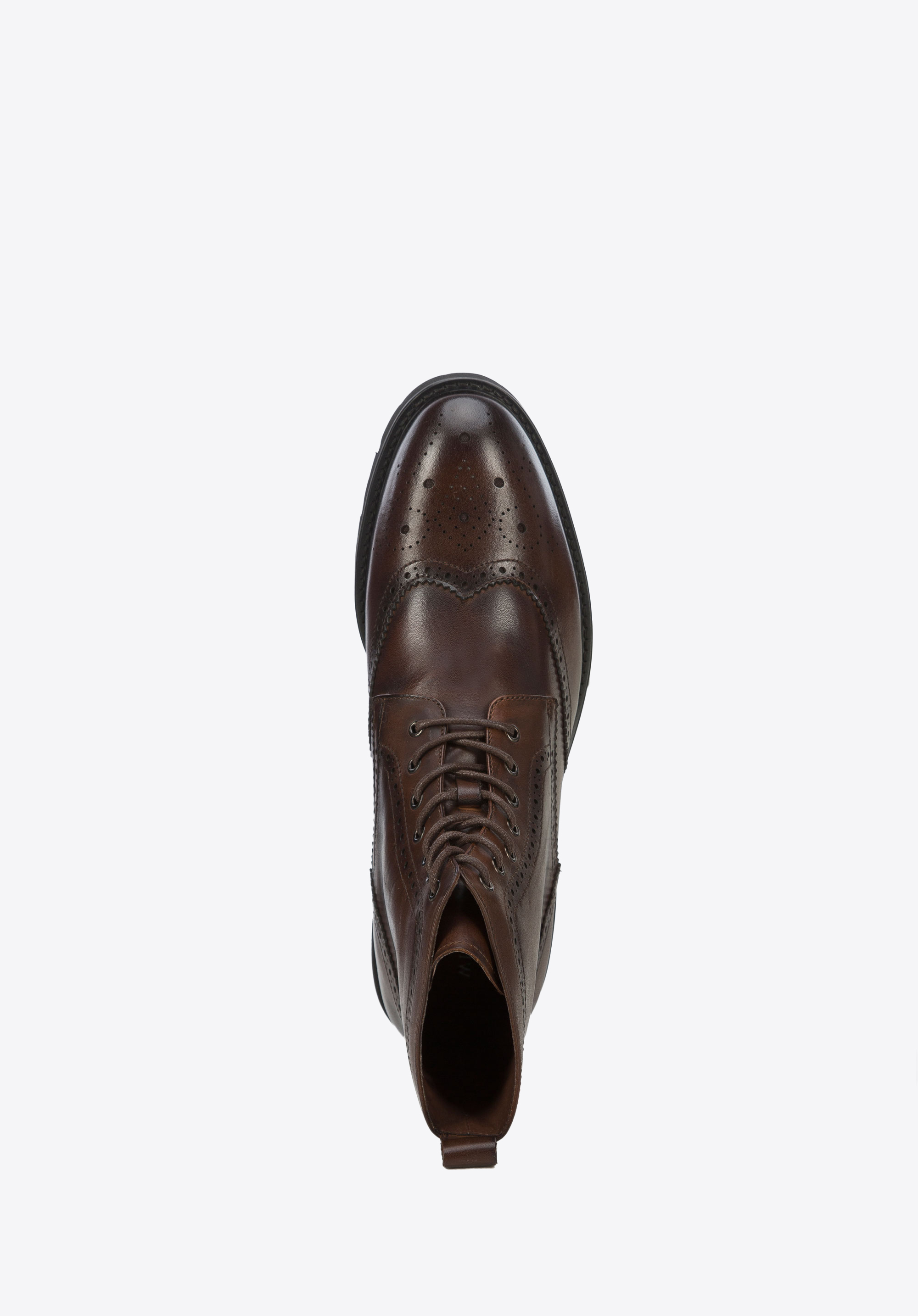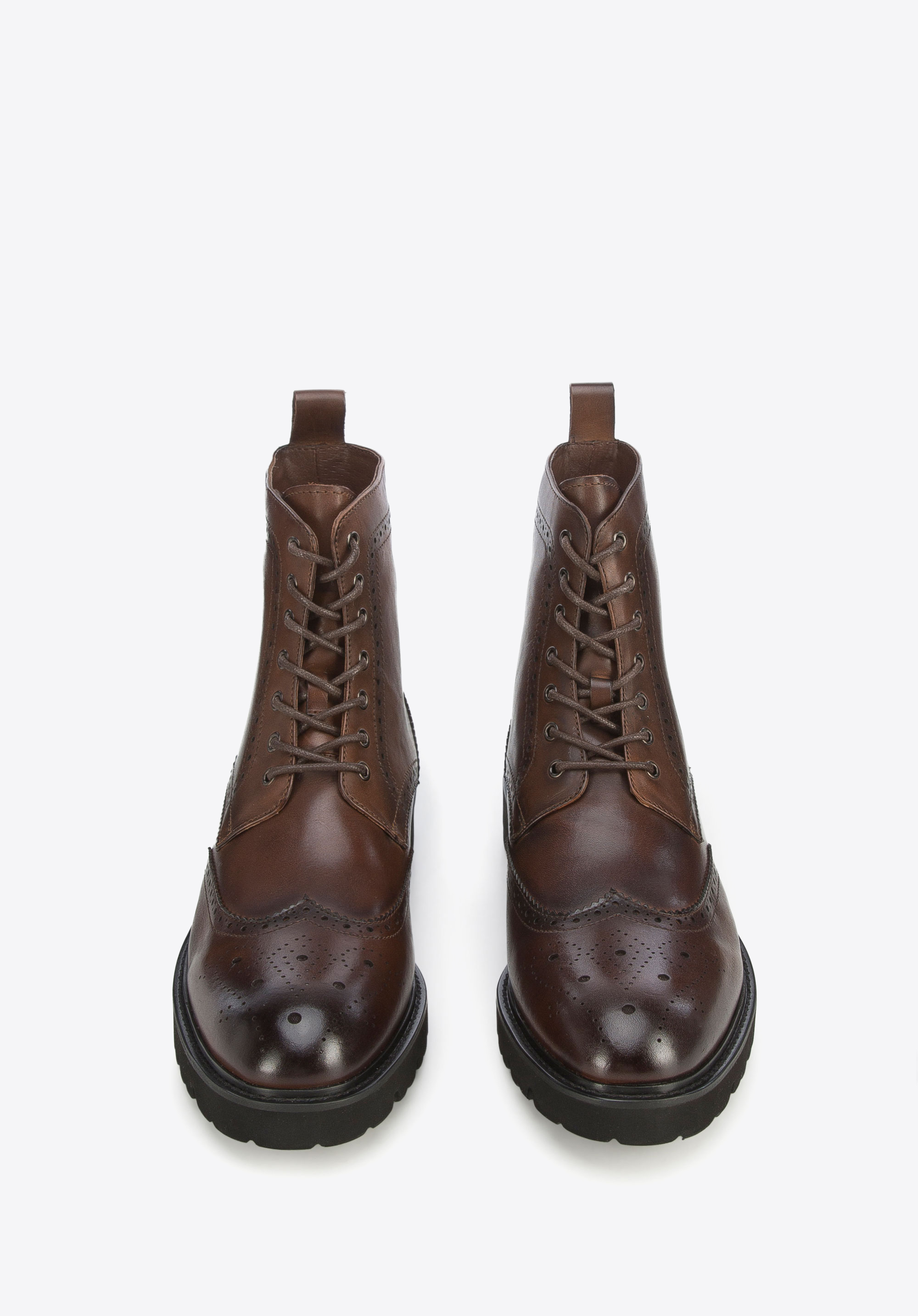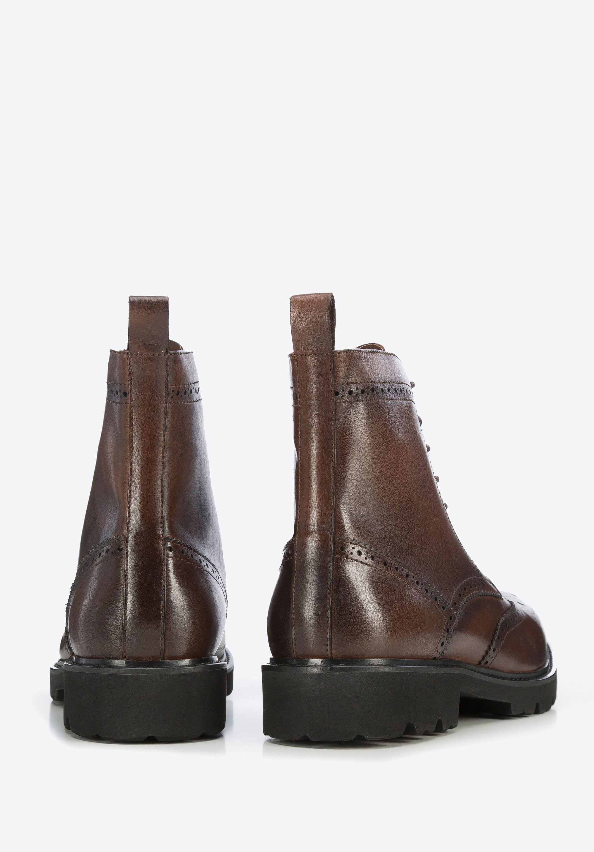 Tyto stylové pánské boty mají klasicky střih. Jsou vyrobeny z kvalitní přírodní kůže. Díky silné podrážce s výrazným nášlapem můžete v nich pohodlně hodit za každého počasí při zachování elegantního stylu. Mají další zesílení na patě a špičce. tyto boty budou vám sloužit mnoho let. Jedná se o skvělý model jak k džínům, tak k obleku s košilí. Pánské kožené boty s ozdobnou perforací jsou jedinečným doplňkem vašeho šatníku na podzim a zimu.