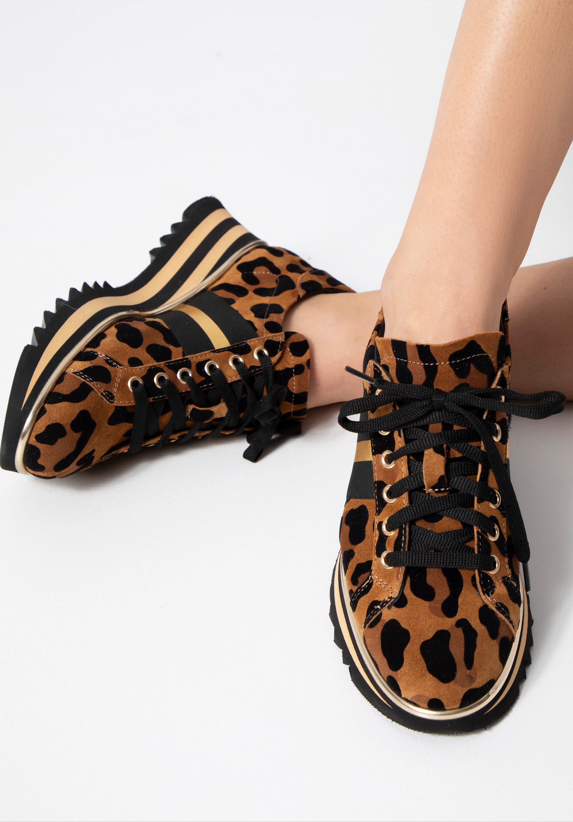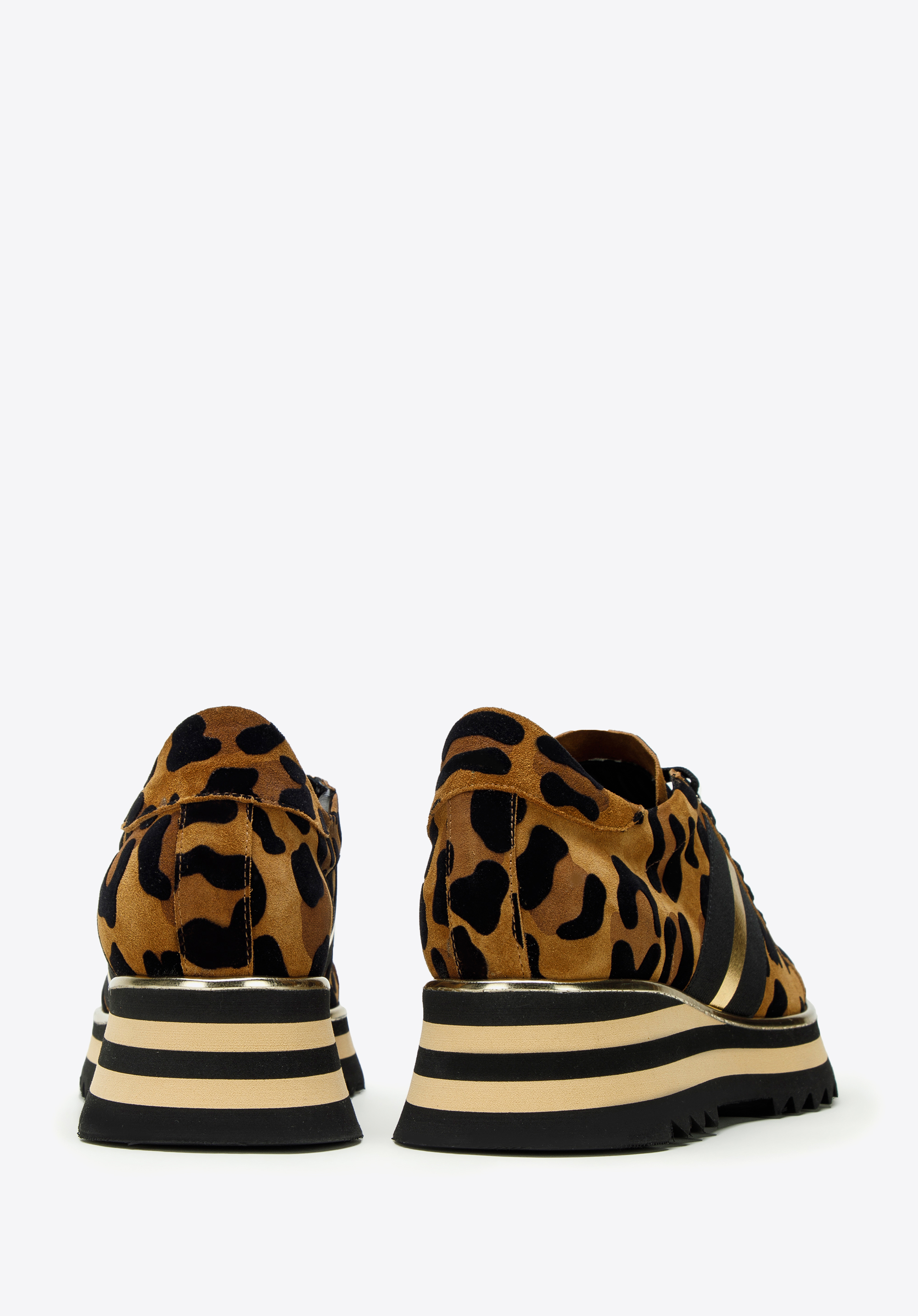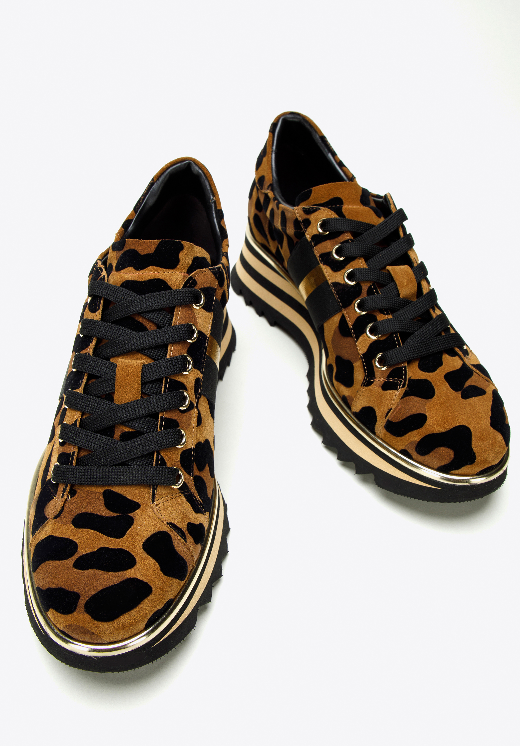 Tyto originální boty dodají každému vašemu obleku eleganci. Zvířecí vzor doplňují zlaté a černé boční pruhy. Pruhovaná platforma je poměrně vysoká, takže přidá vám na výšce pár centimetrů. Boty jsou vyrobeny z vysoce kvalitní semišové kůže. Díky kožené vložce můžete je pohodlně nosit mnoho hodin. Sportovní střih v kombinaci s módním vzorem obohatí každý oblek. Dámské semišové boty se zvířecím potiskem jsou stylovým a pohodlným doplňkem, který se vyplatí mít ve svém šatníku.