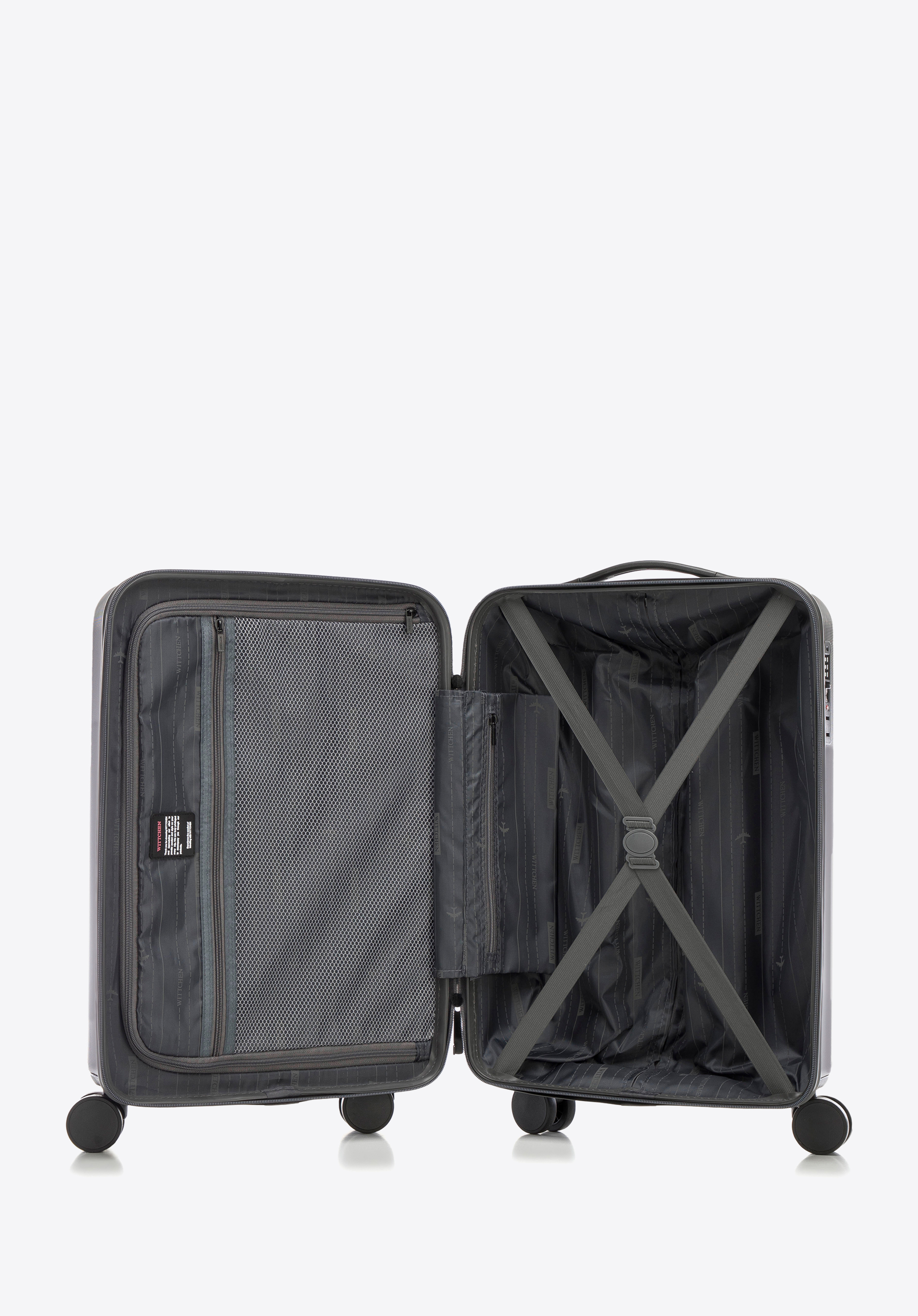 Tento originální kufr dodá styl každé vaší cestě. Je vyroben z ABS-u s jemným leskem. Klasický tvar s mírně zaoblenými rohy, obohatí přední stranu s vyraženými malými proužky. Uvnitř je několik kapes na zip a popruhy, které ochrání obsah před pohybem. Tento malý model je skvělou volbou na krátký víkendový výlet. Navíc můžete si ho vzít na palubu většiny leteckých společností. Kabinový kufr z ABS-u se svislými pruhy je skvělou volbou pro každého, kdo rád cestuje v jedinečném stylu.