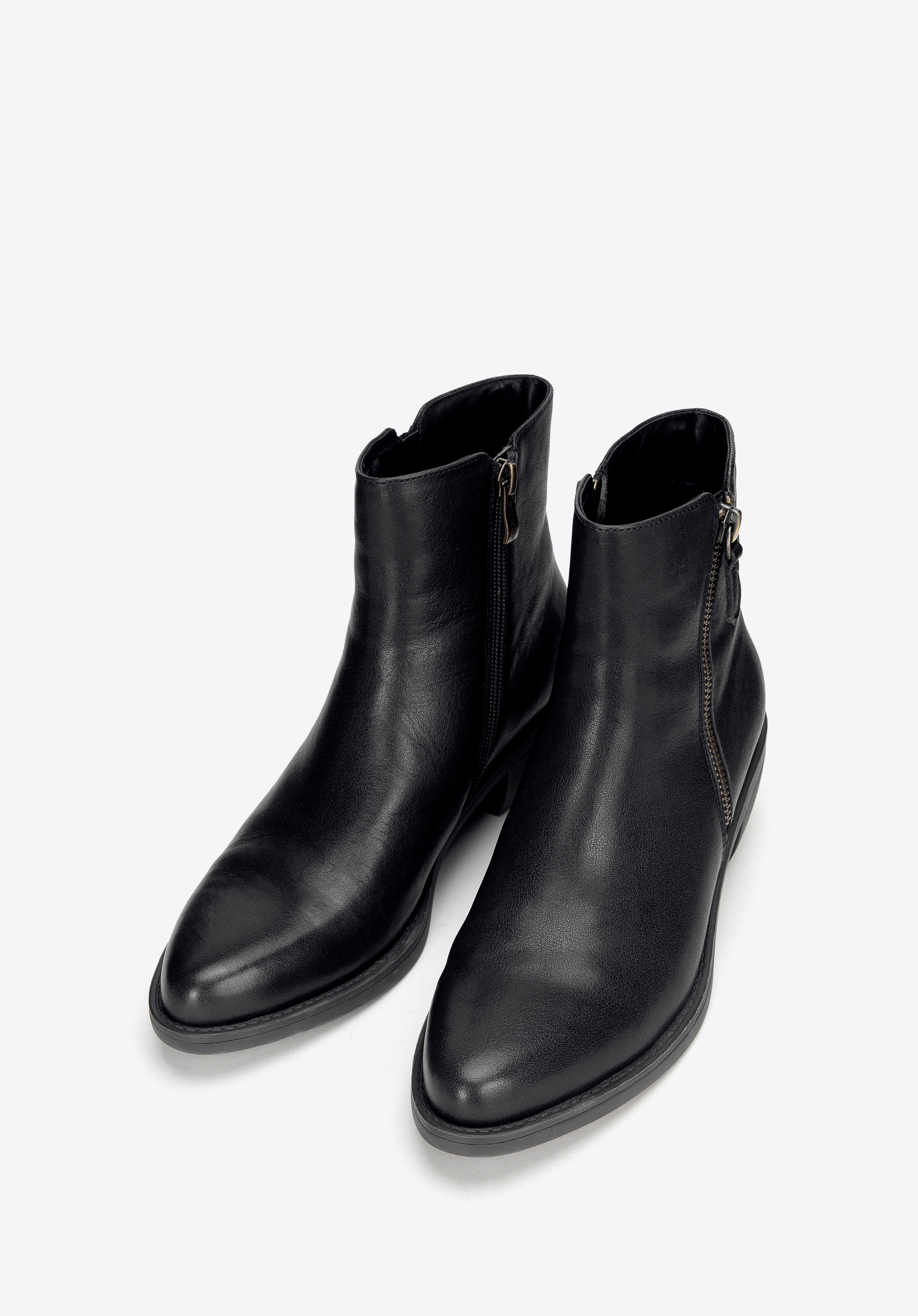 Tyto klasické kožené kotníkové boty jsou kombinací elegance a pohodlí. Jsou vyrobeny z vysoce kvalitní přírodní kůže a budou perfektní volbou pro chladnější dny. Jejich jednoduchý, ale nadčasový tvar podtrhuje zip na boku, který dodává jim nejen charakter, ale také usnadňuje rychlé nazouvání. Nízký stabilní podpatek umožňuje pohodlné nošení po celý den bez ohledu na příležitost. Budou vám sloužit mnoho sezón a zůstanou ve skvělé kondici.