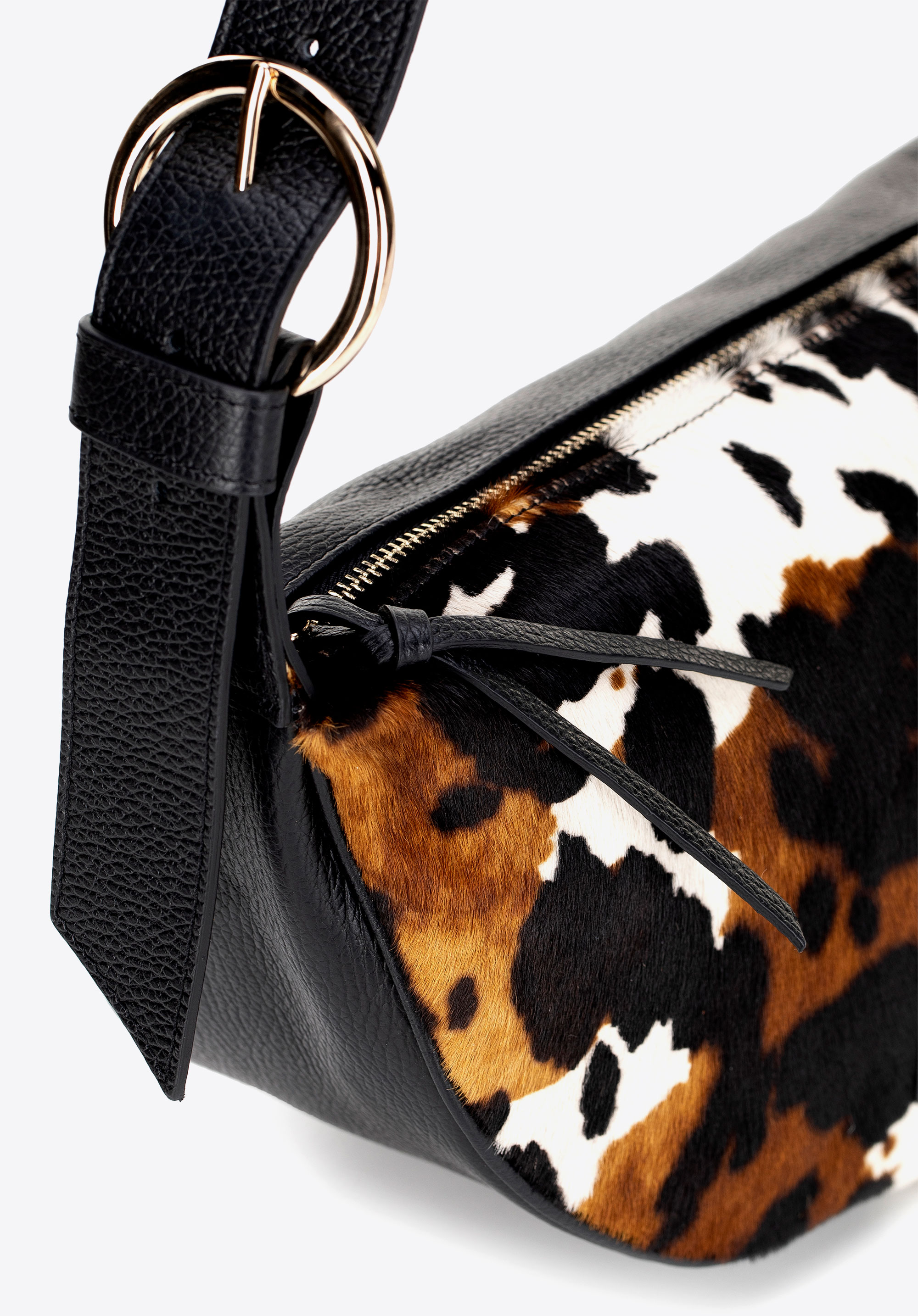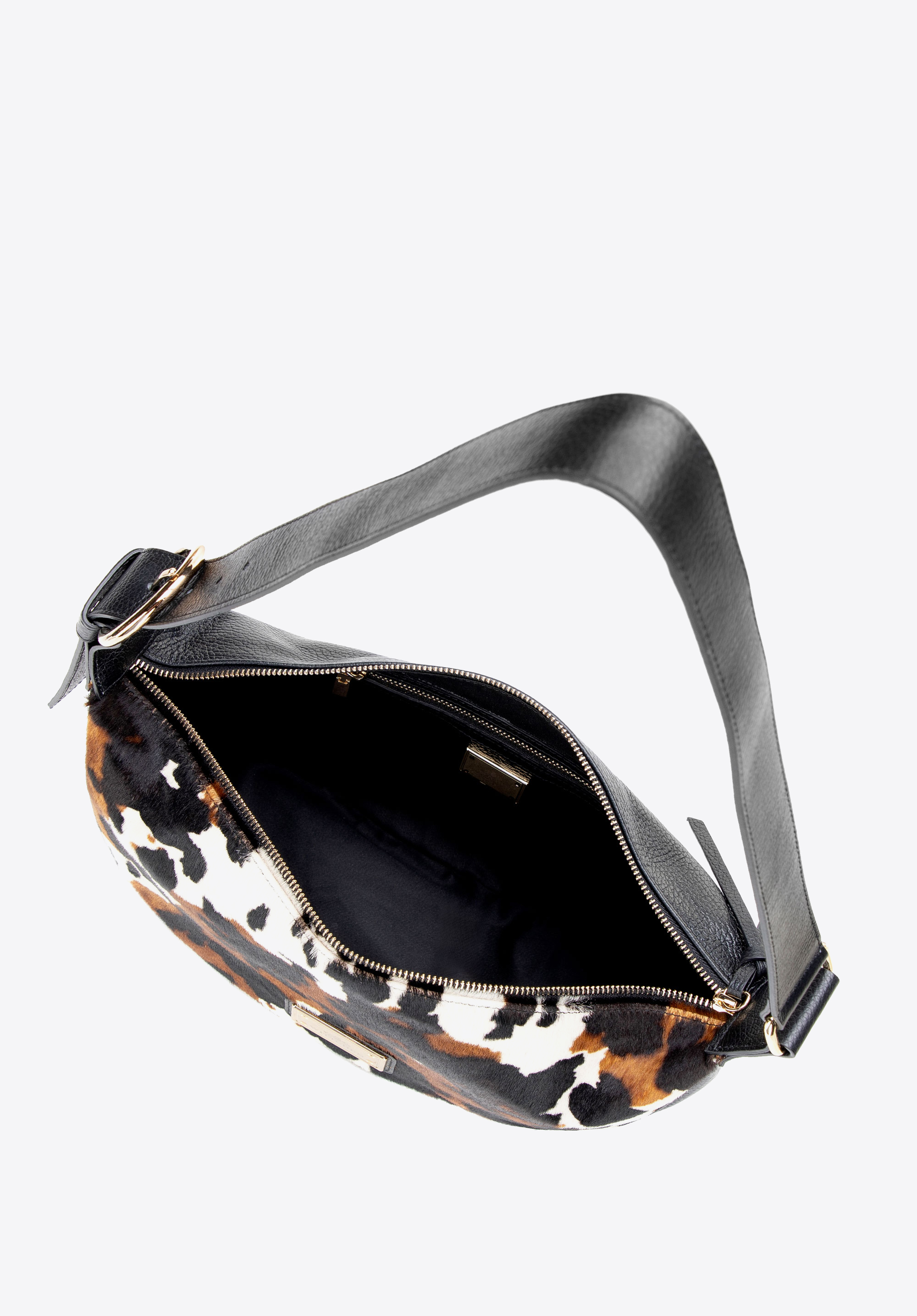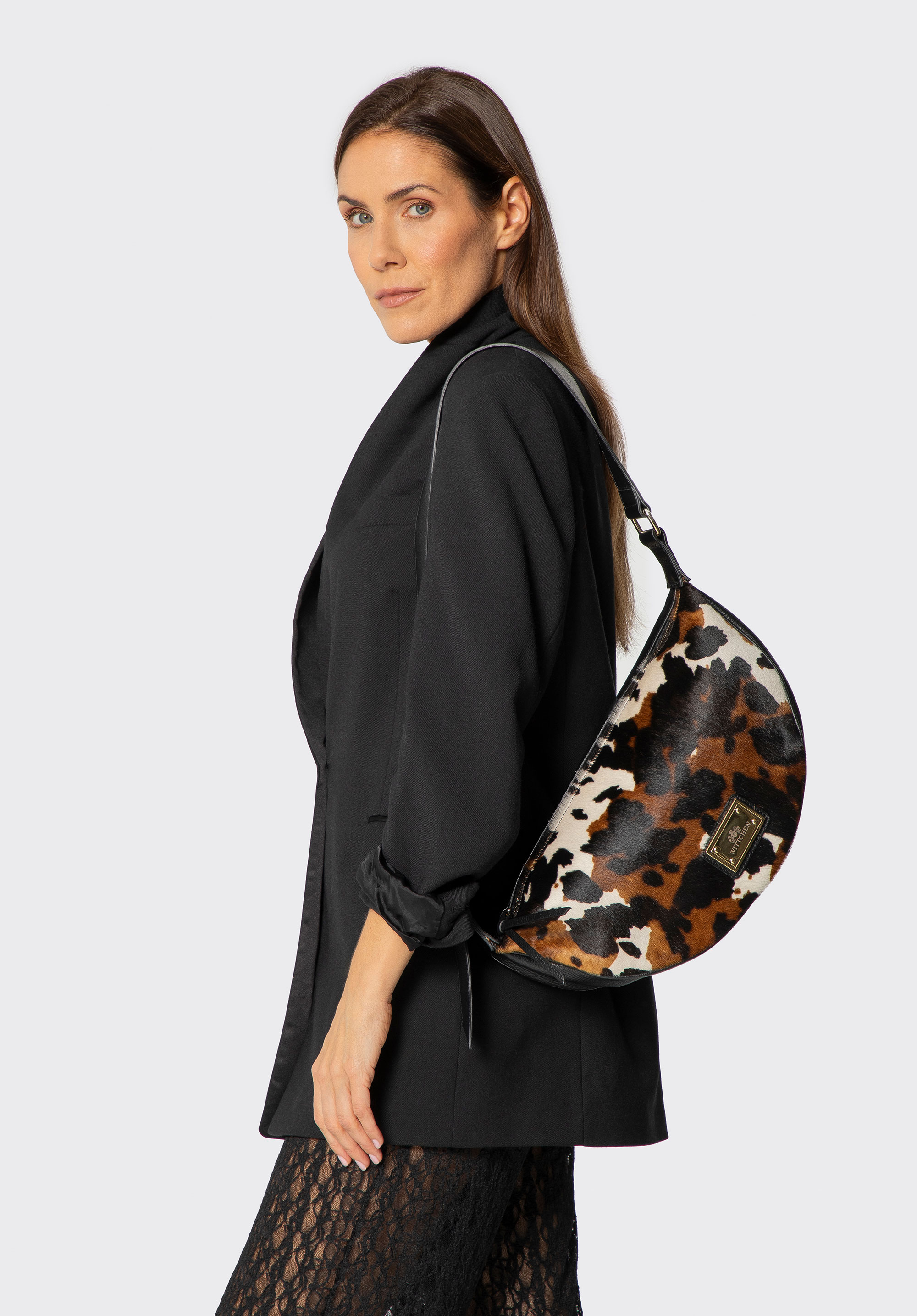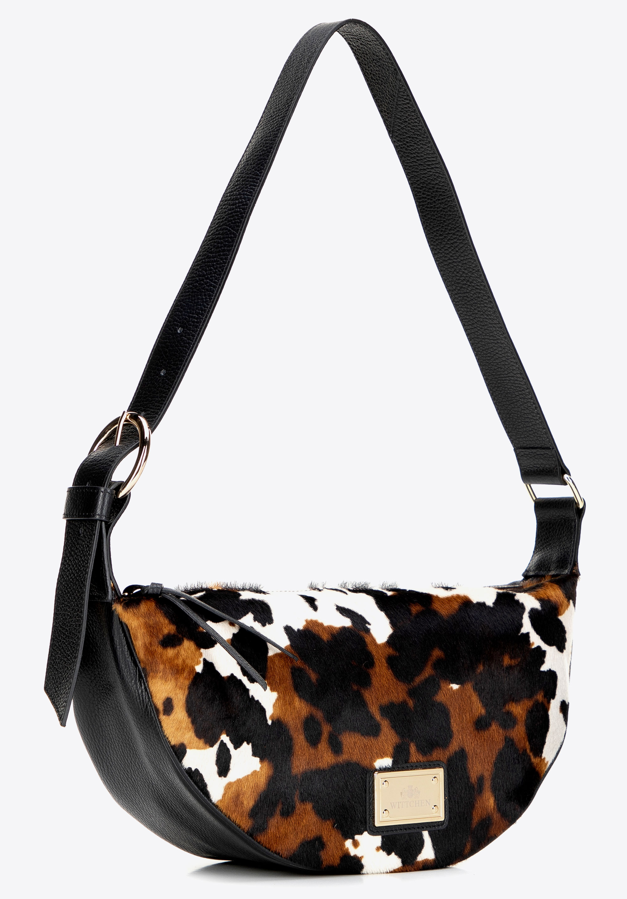 Dodá vašemu vzhledu nádech decentní elegance s italským šmrncem! Tato dámská kabelka v půlměsícovitém tvaru je vyrobena z nejjemnější přírodní telecí kůže s jemným chlupem na přední straně, který jí dodává charakter a osobitý nádech. Pečlivě vyrobená v Itálii potěší bezchybným řemeslným zpracováním a důrazem na detail – od zlatého kování až po logo značky na přední straně. Nastavitelný popruh umožňuje nošení na rameni nebo jako crossbody , zatímco zapínání na zip zajišťuje bezpečí všech vašich nezbytností.