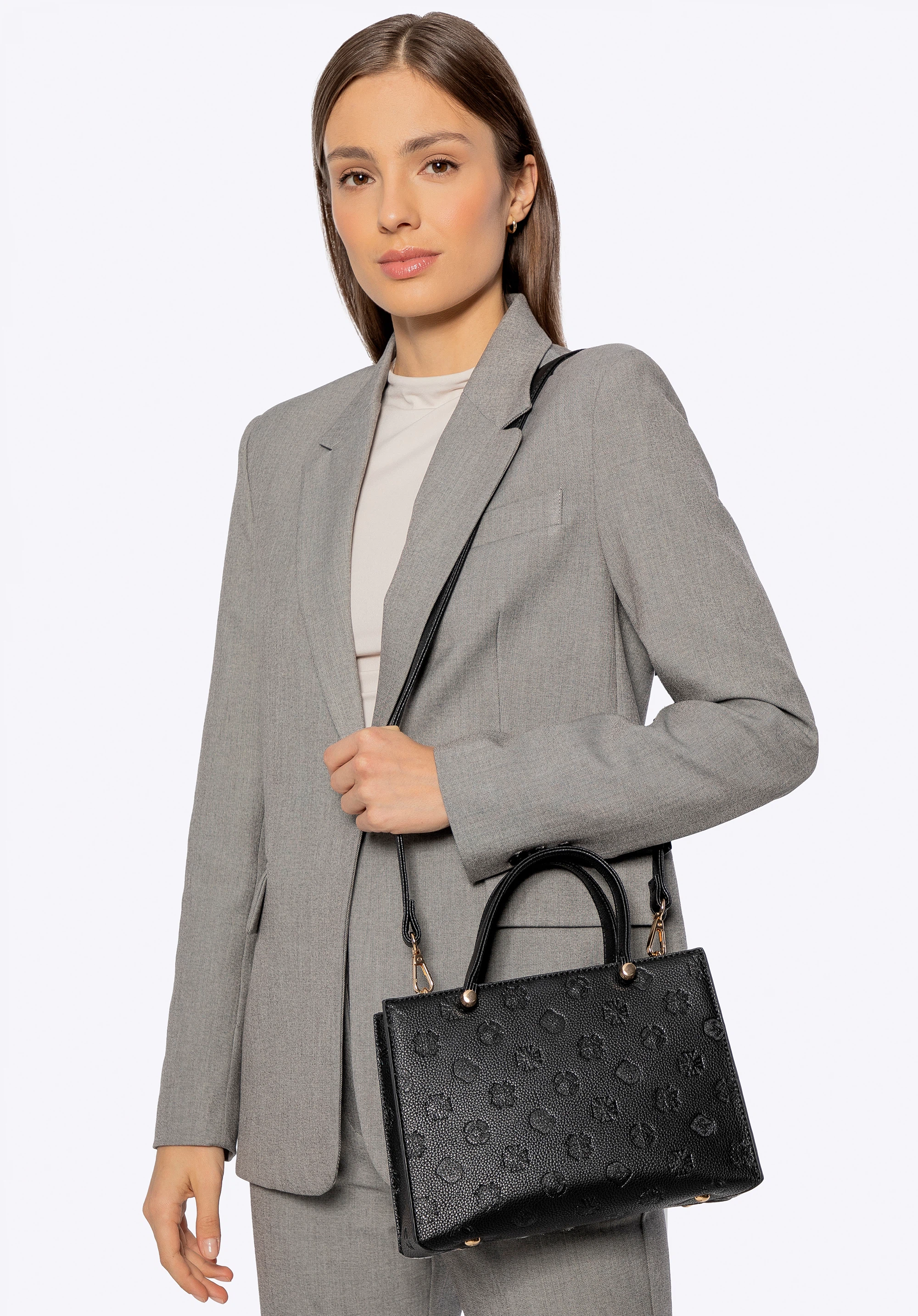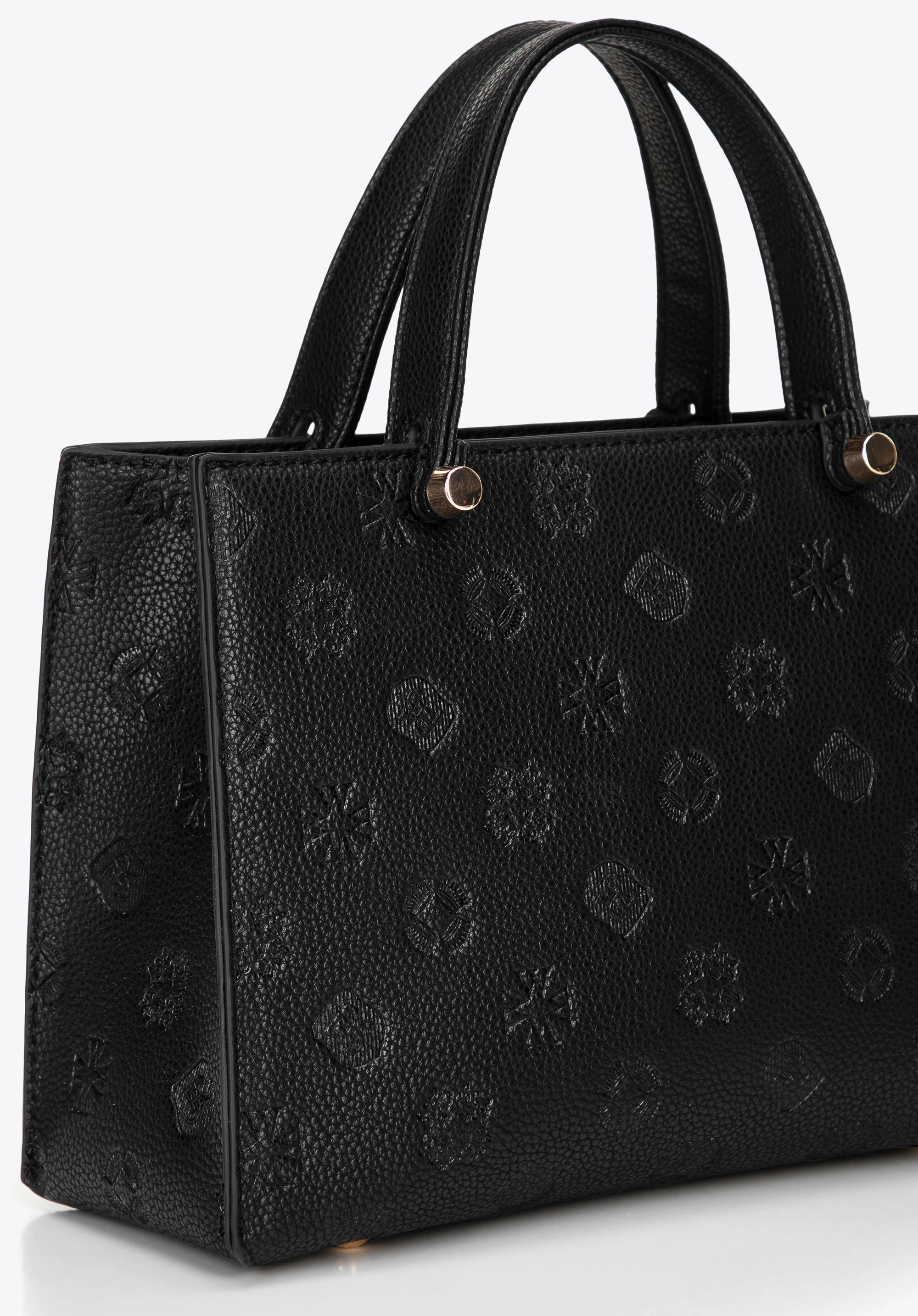 Pokud hledáte kabelku , která zaujme svými detaily a je ideální pro každodenní nošení, tato malá strukturovaná kabelka z umělé kůže je perfektní volbou. Její kompaktní siluetu umocňuje celoplošná reliéfní textura a rafinovaný design. Krátká ucha umožňují nošení v ruce, zatímco odnímatelný, nastavitelný popruh umožňuje pohodlné nošení přes rameno. Uvnitř najdete tři kapsy , z nichž jedna je na zip, pro přehledné a bezpečné uložení vašich nezbytností.