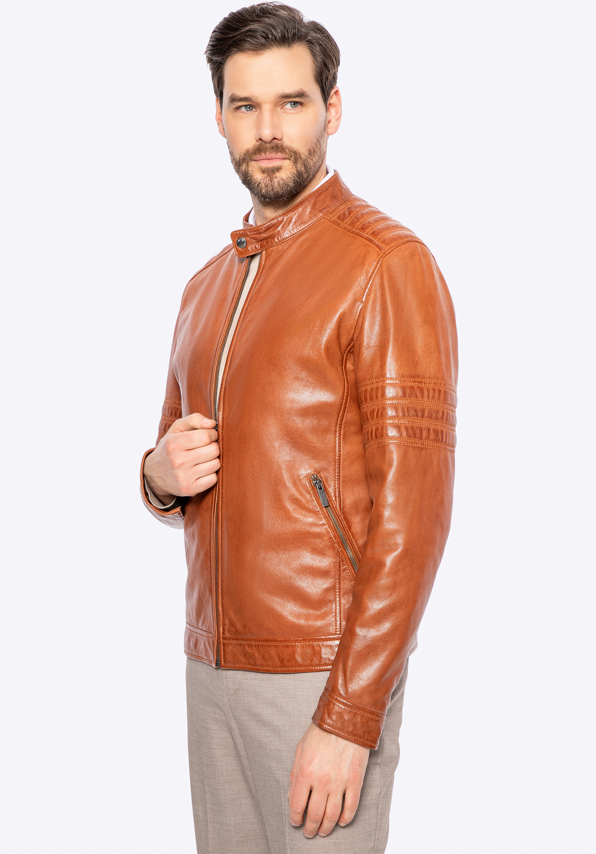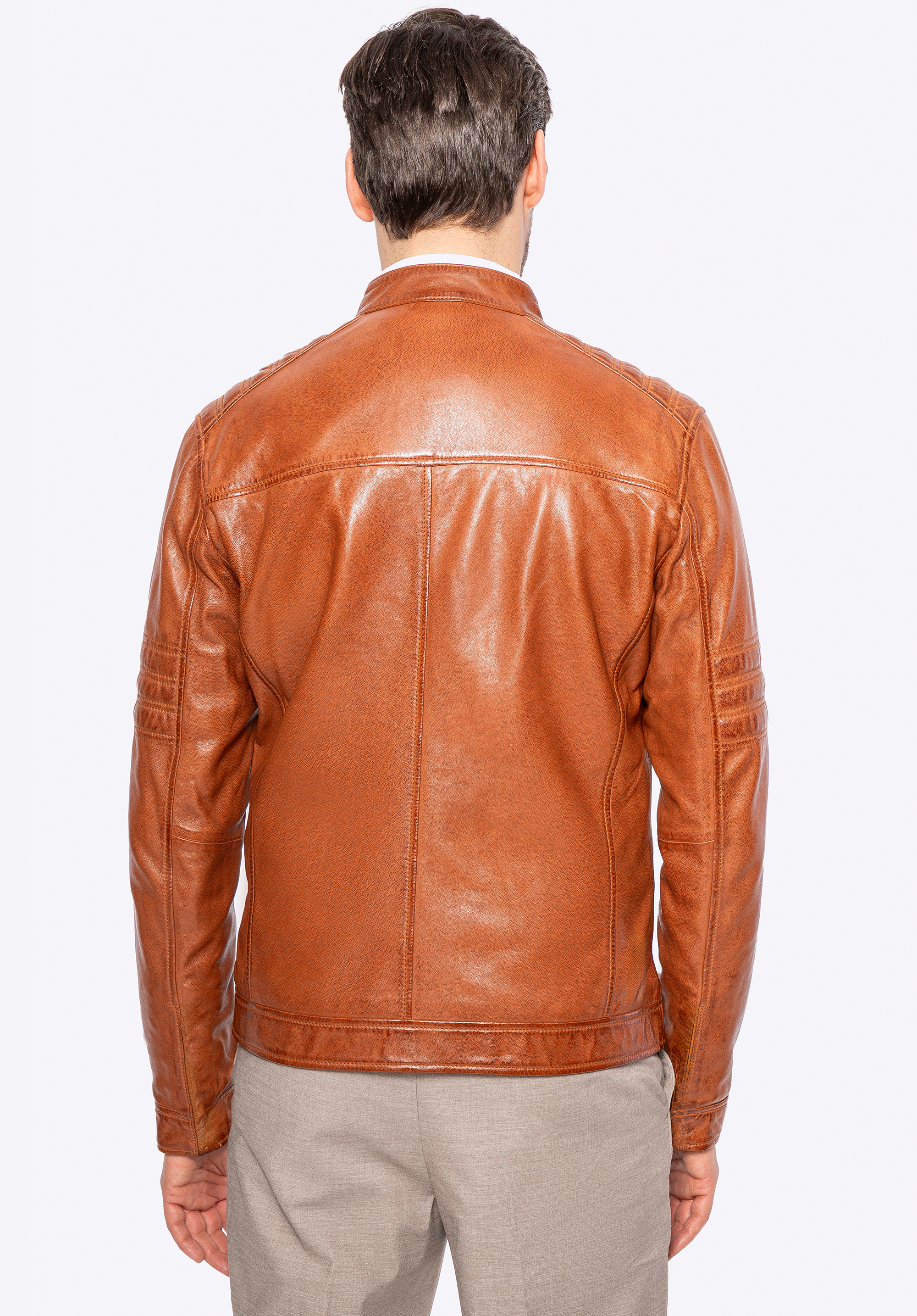 Pánská kožená motorkářská bunda s prošívanými panely Barva: světle hnědá
