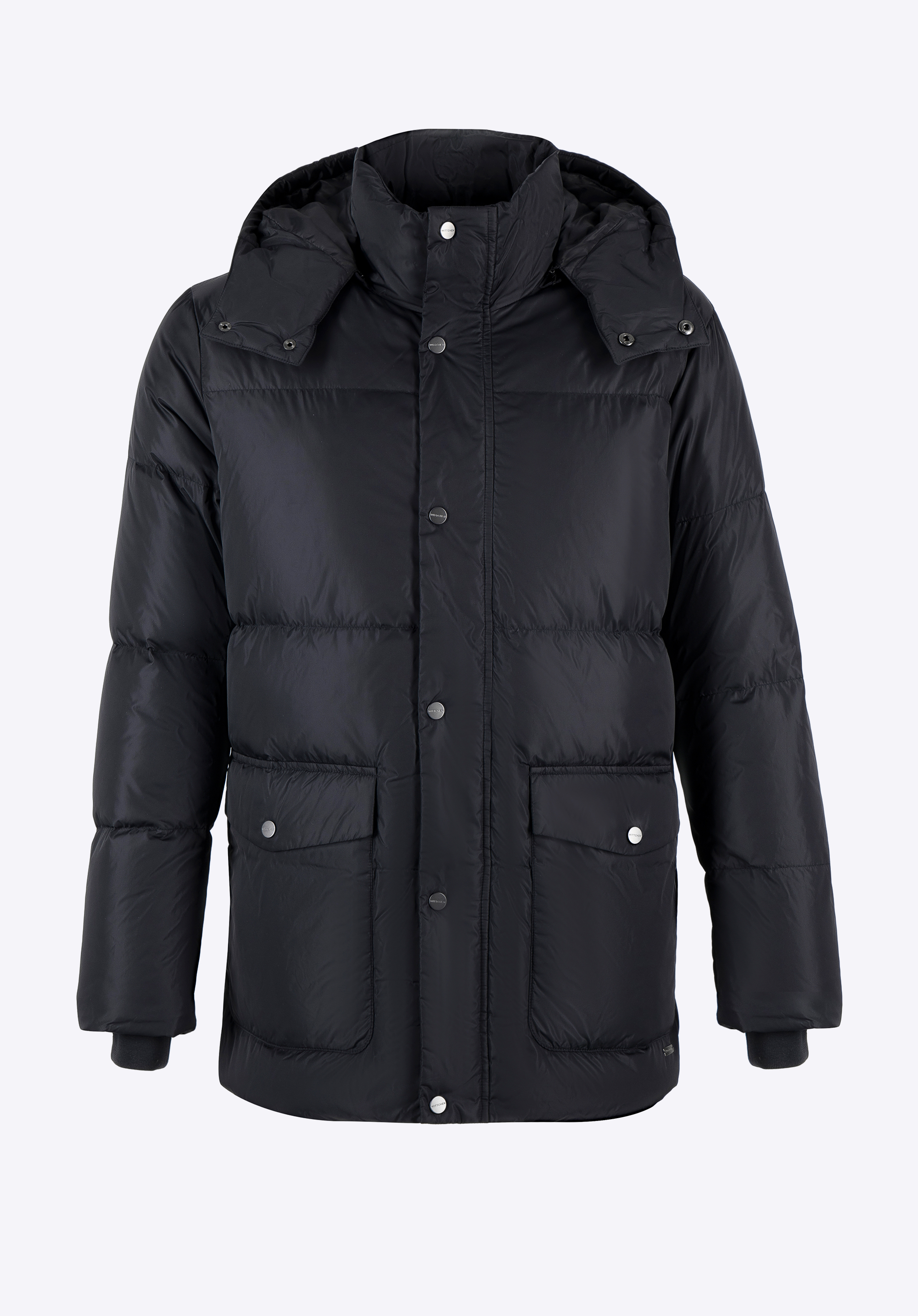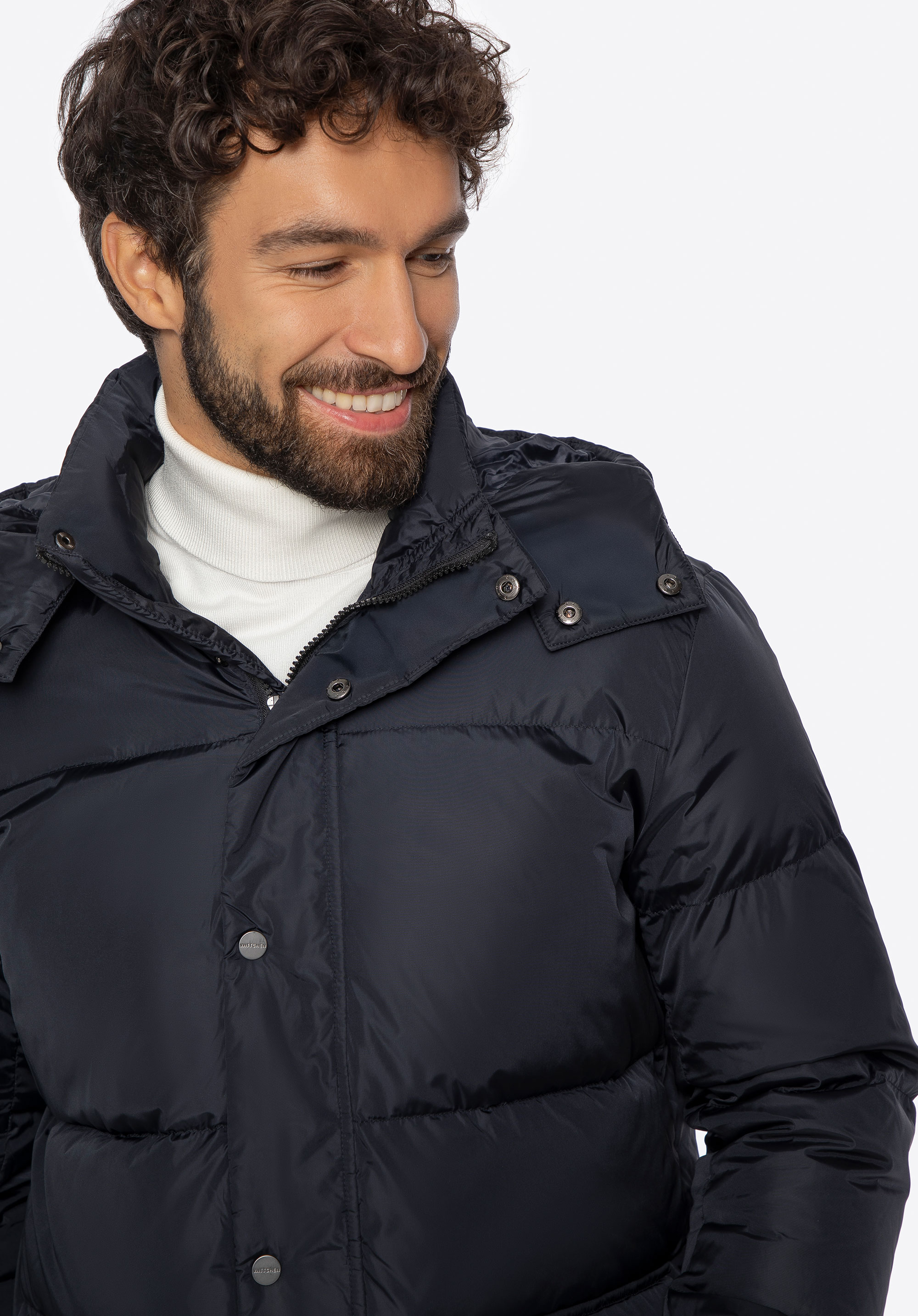 Objevte, jak se mužská elegance snoubí s řemeslným zpracováním v této péřové bundě s odepínací kapucí.
