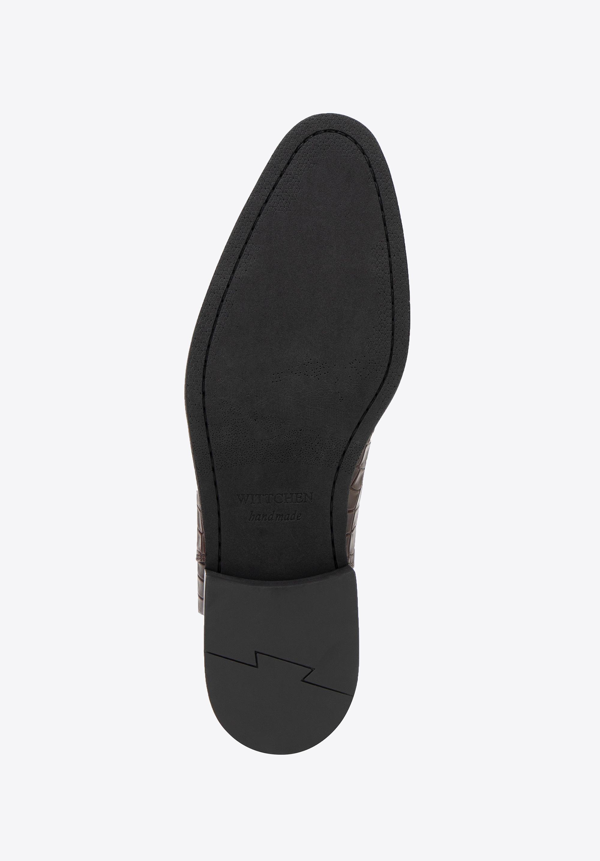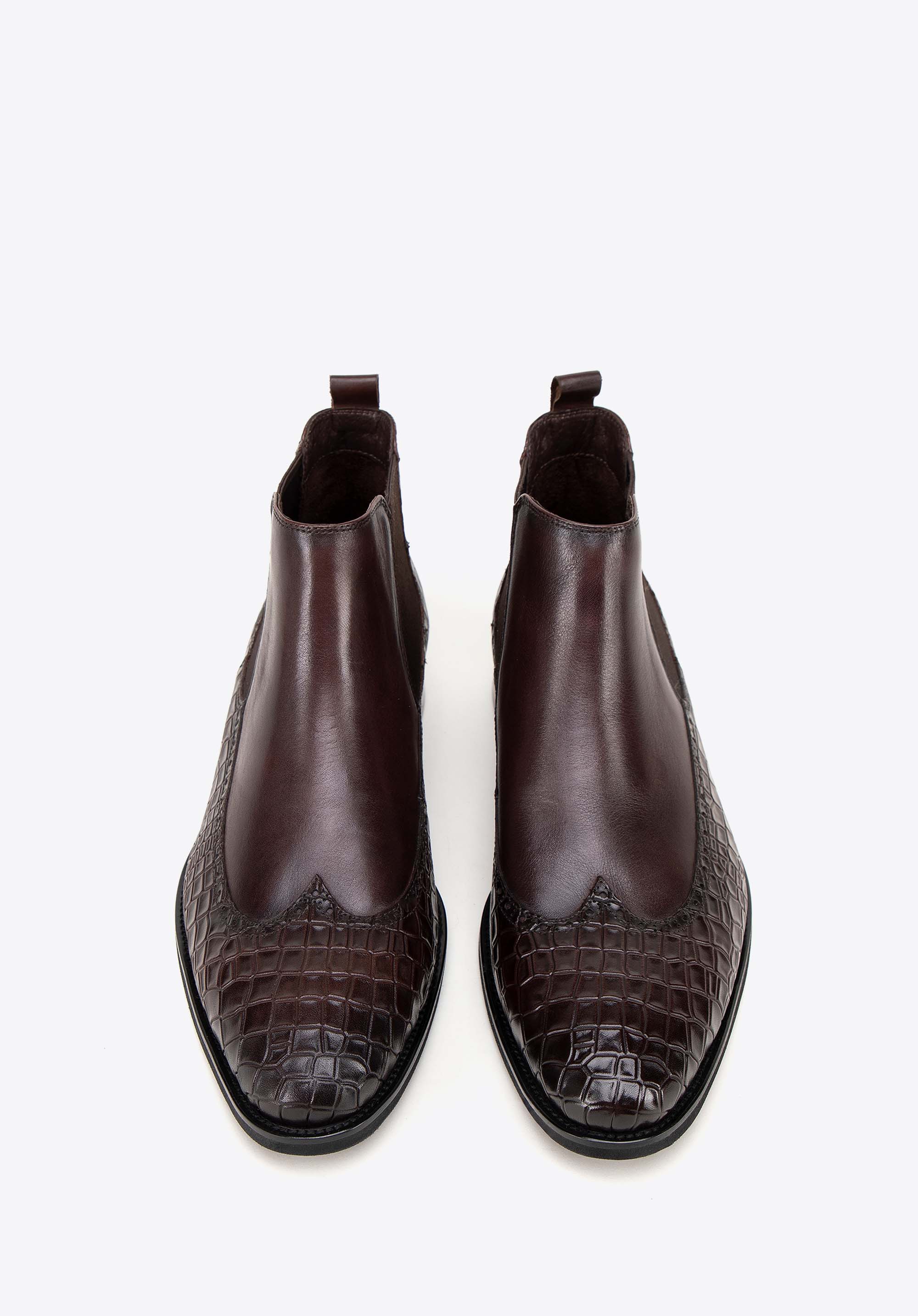 Tyto pánské boty spojují eleganci s jedinečným designem. Jsou vyrobeny z nejkvalitnější přírodní lícové kůže a s věkem získávají charakter. Díky klasické ploché podrážce a elastickým vsadkám na bocích tyto boty jsou nejen stylové, ale také velmi pohodlné. Milovníci jedinečných akcentů ocení detaily, jak je motiv imitující krokodýlí kůži a mandlový nos zdobený perforovanými křídly. Tyto boty jsou perfektním způsobem, jak zdůraznit váš individuální styl, bez ohledu na příležitost.