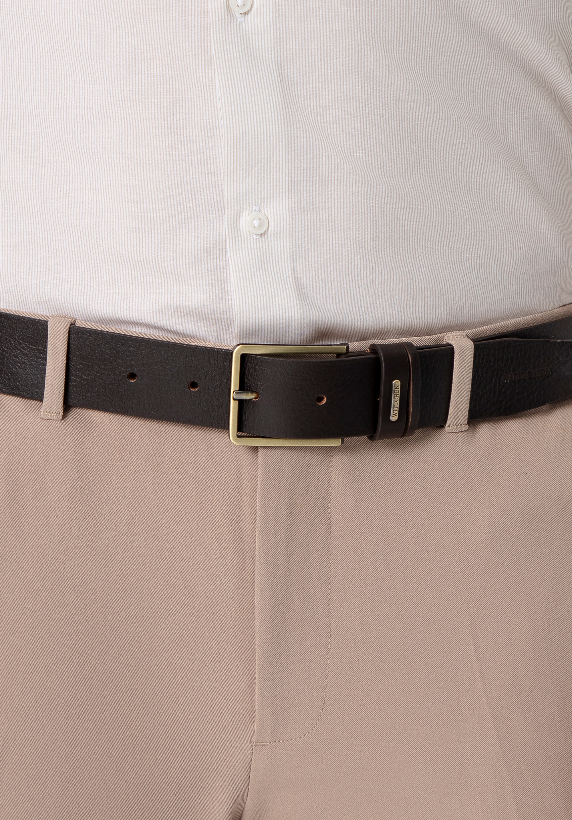 - Velká kovová přezka: Obdélníková pevná přezka dodává celkovému vzhledu výrazný nádech, přesto zůstává elegantní a nadčasová. Je to detail, který přitahuje pozornost a zdůrazňuje moderní charakter opasku, aniž by ztratil svou klasickou estetiku.