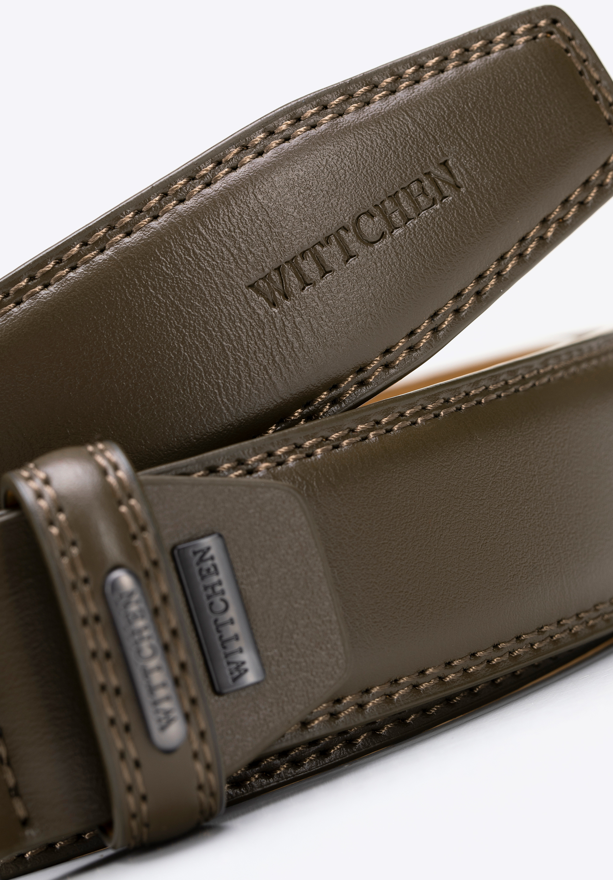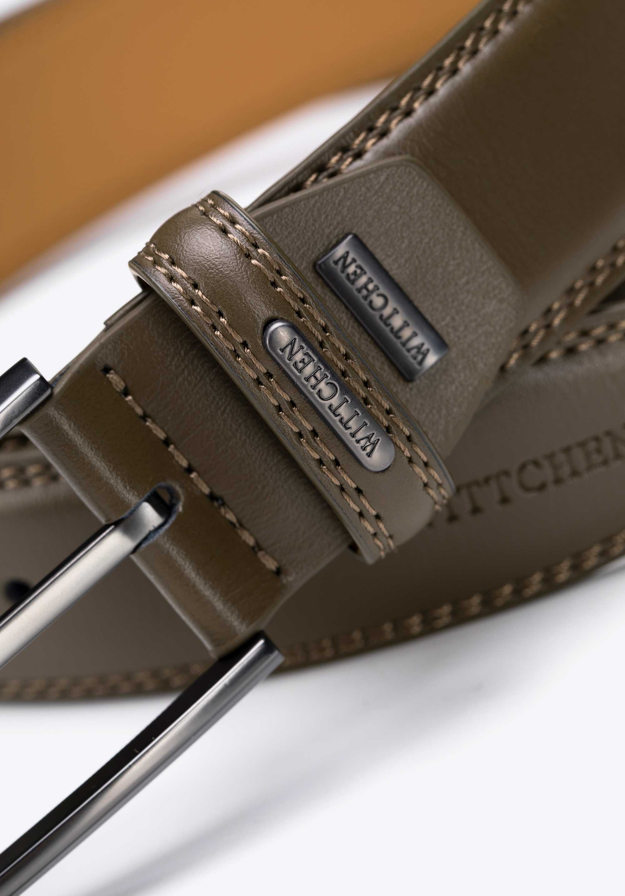 - Reliéfní logo značky: Diskrétně umístěné na konci opasku – symbol kvality a nadčasového stylu.