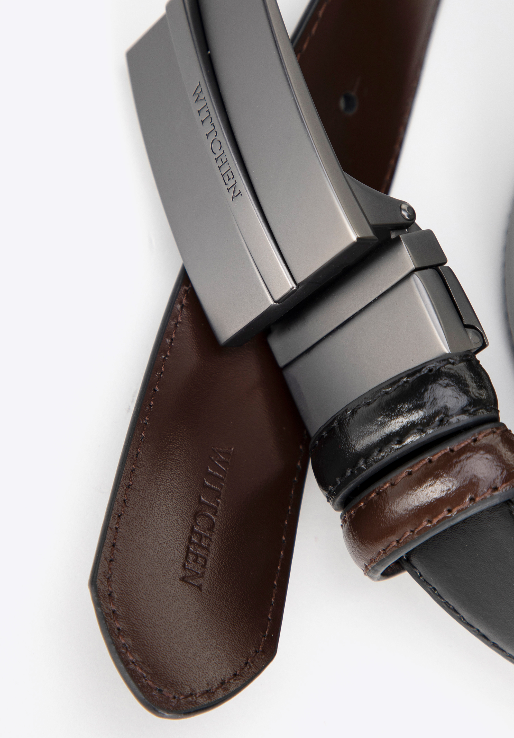 - Detaily: Logo výrobce vyražené na konci řemínku zdůrazňuje jeho luxusní charakter a kovové prvky u přezky svědčí o vysoké kvalitě zpracování.