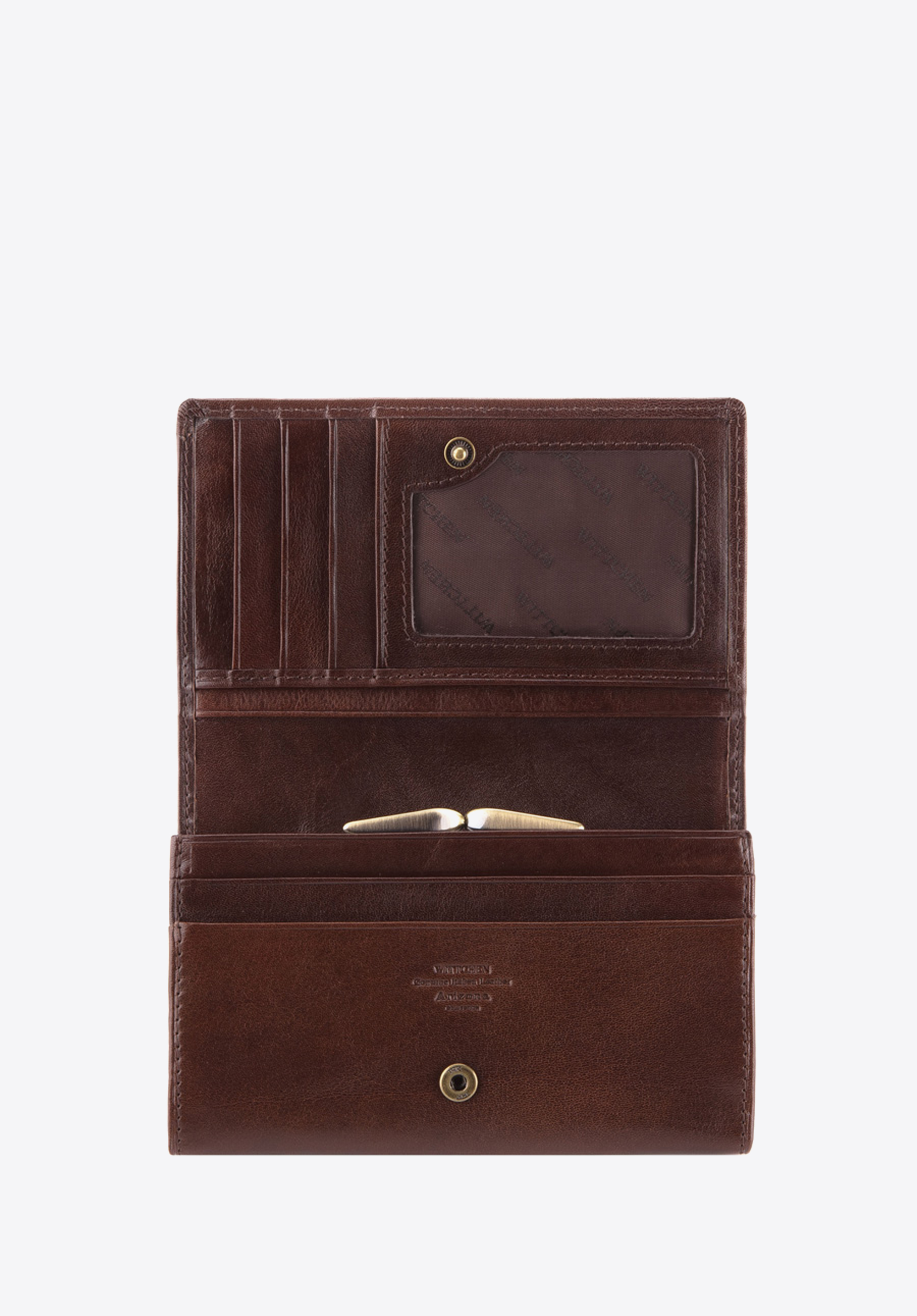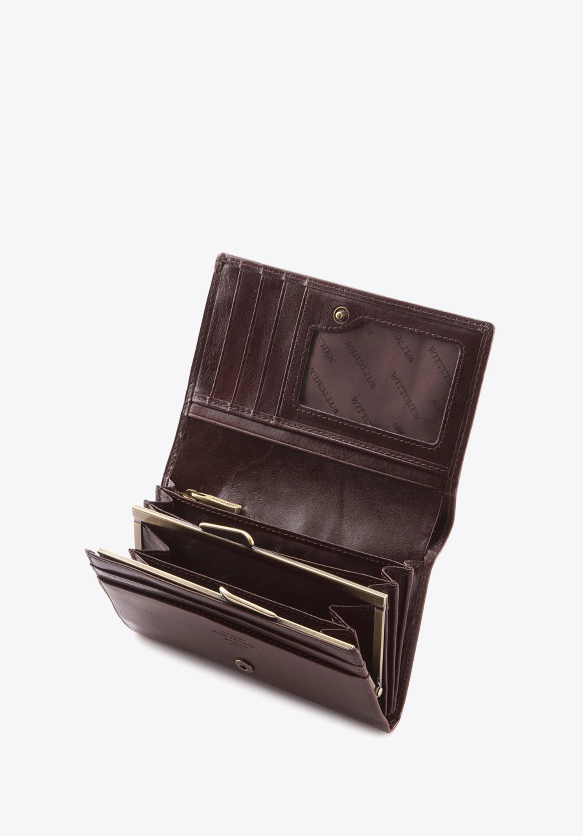 Velká dámská peněženka je velmi pečlivě vyrobená z nejkvalitnější, lesklé přírodní kůže. Má ozdobu ve tvaru erbu WITTCHEN, v barvě starého zlata. Tento výrobek je dodáván v elegantní krabici WITTCHEN. Je ideální pro moderní ženy, kterým se libí elegantní produkty.