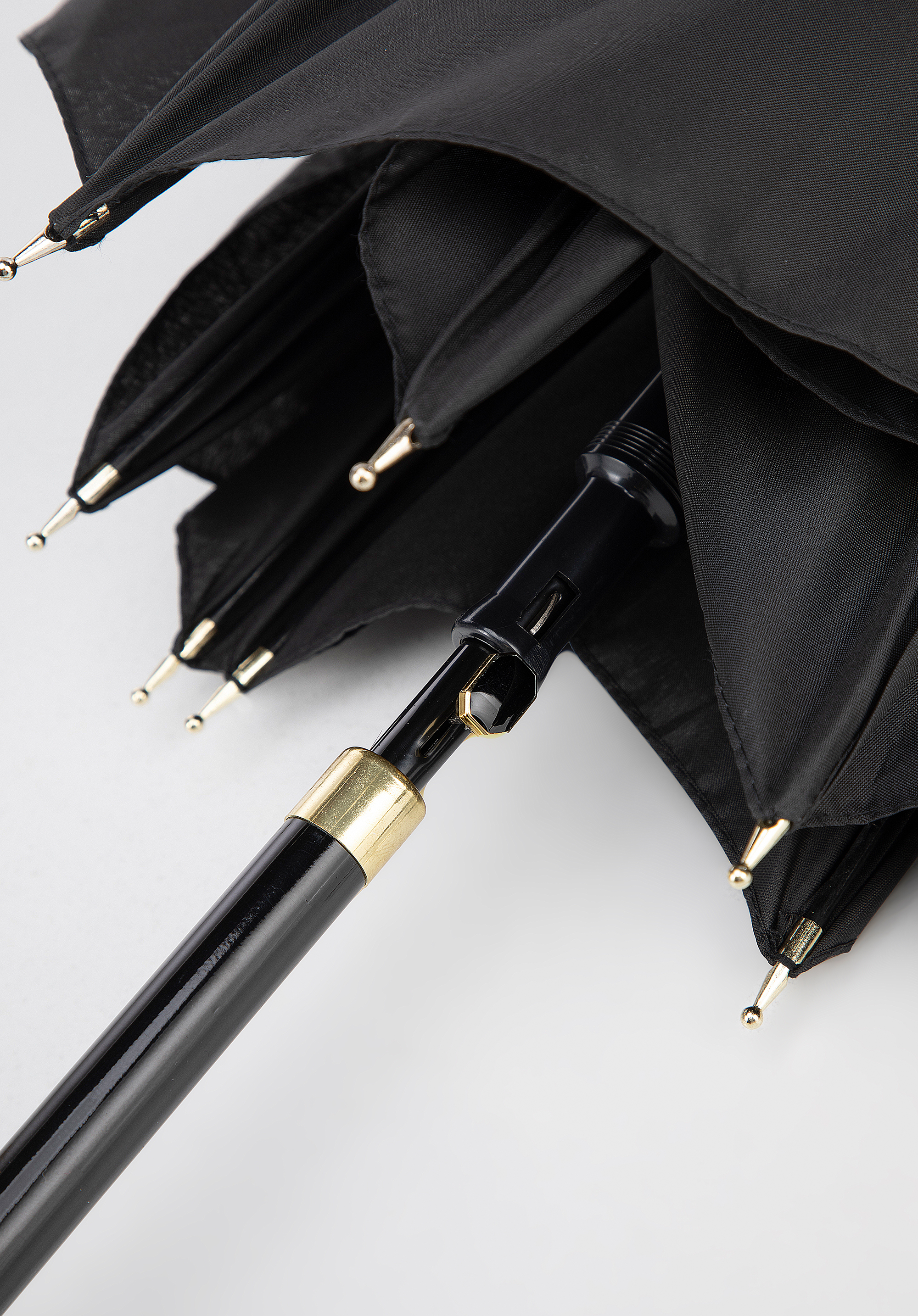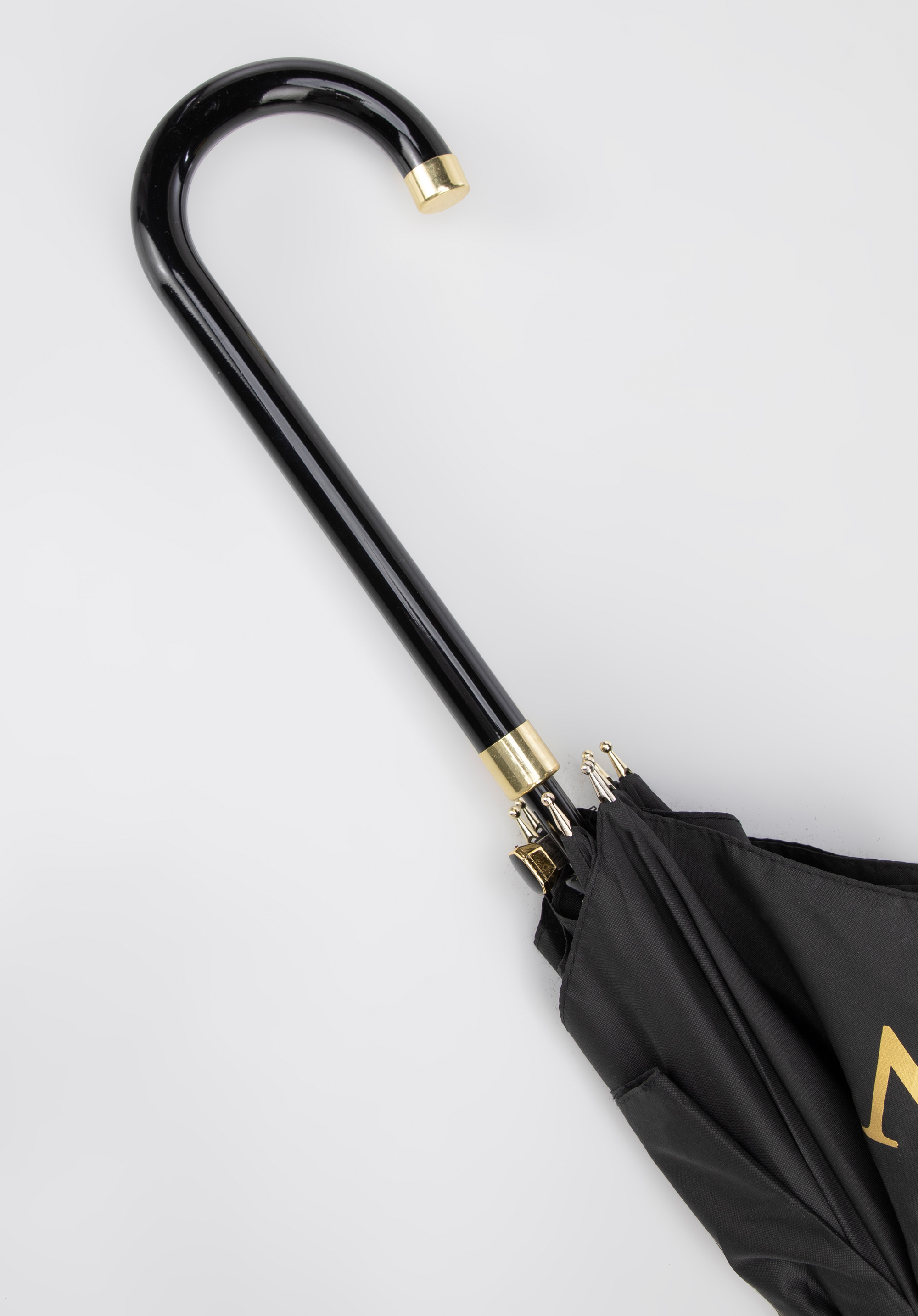 Tento deštník je fantastickým doplňkem pro ty, kteří ocení elegantní doplňky. Kombinace černé a zlaté barvy dodává deštníku luxusní nádech. Lesklá černá rukojeť je zakončena zlatým detailem. Rám deštníku se skládá z kovové tyče a 8 sklolaminátových žeber. Voděodolná polyesterová stříška poskytuje dodatečnou ochranu před sluncem a větrem.
