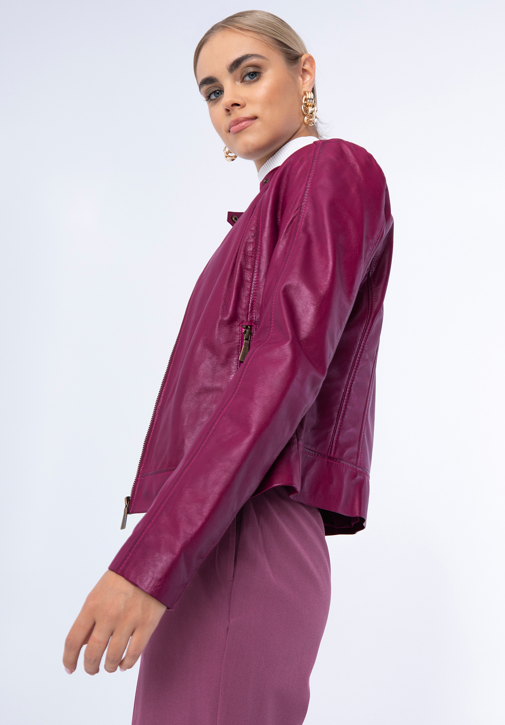 Tato přechodná bunda je určena pro každou ženu, která cení nadčasové doplňky. Je vyrobena z kvalitní jemné ovčí kůže, takže jde o doplněk, který vydrží roky. Klasický tvar s pohodlnými kapsami lze nosit na jaře, v létě i na podzim. Díky stojáčku zapínanému na patentku pěkně odkryjete krk. Dámská klasická kožená bunda se stojáčkem hodí se k mnoha stylům. Můžete ji nosit do práce i na víkendový výlet – budete vypadat elegantně za každé situace.