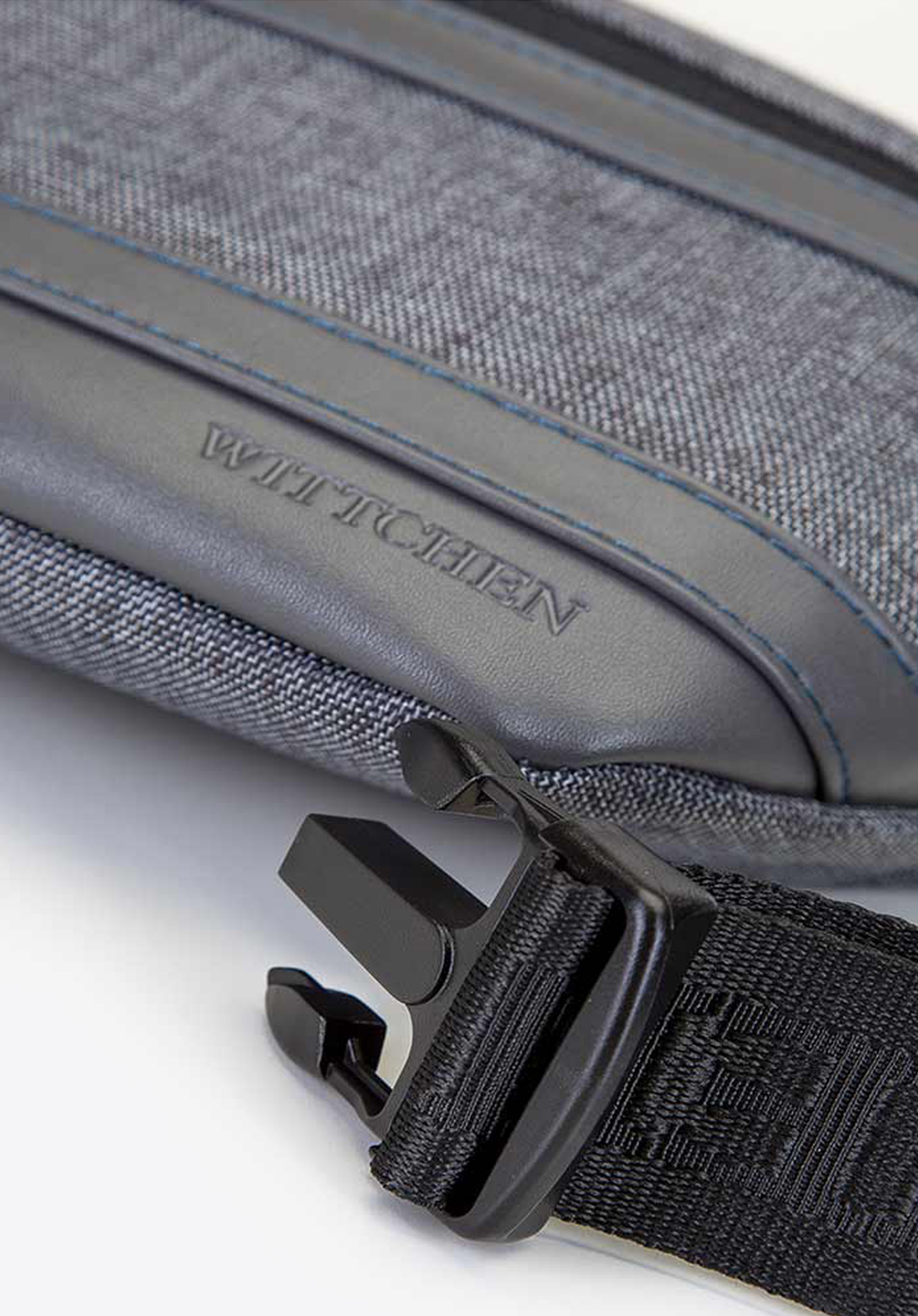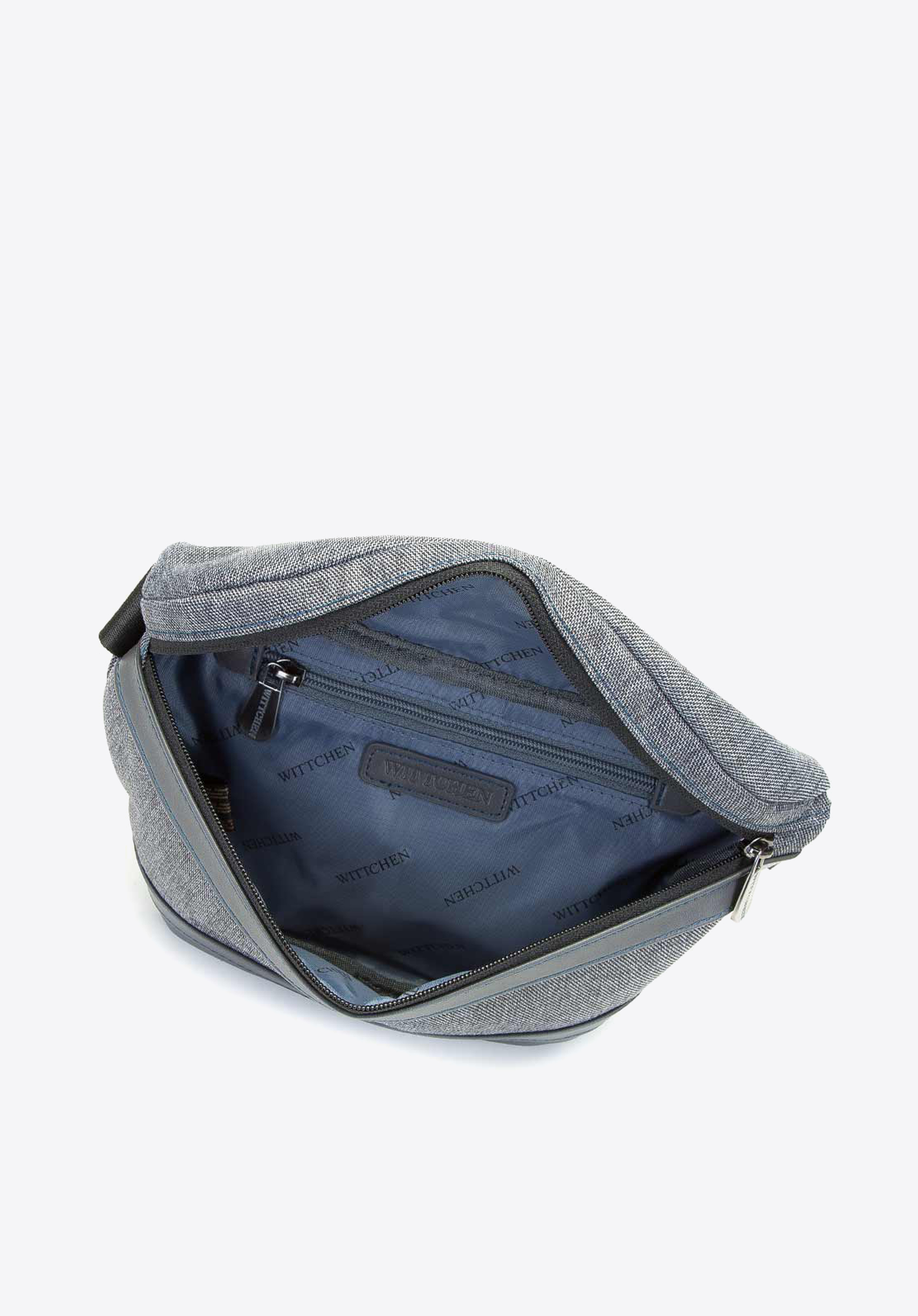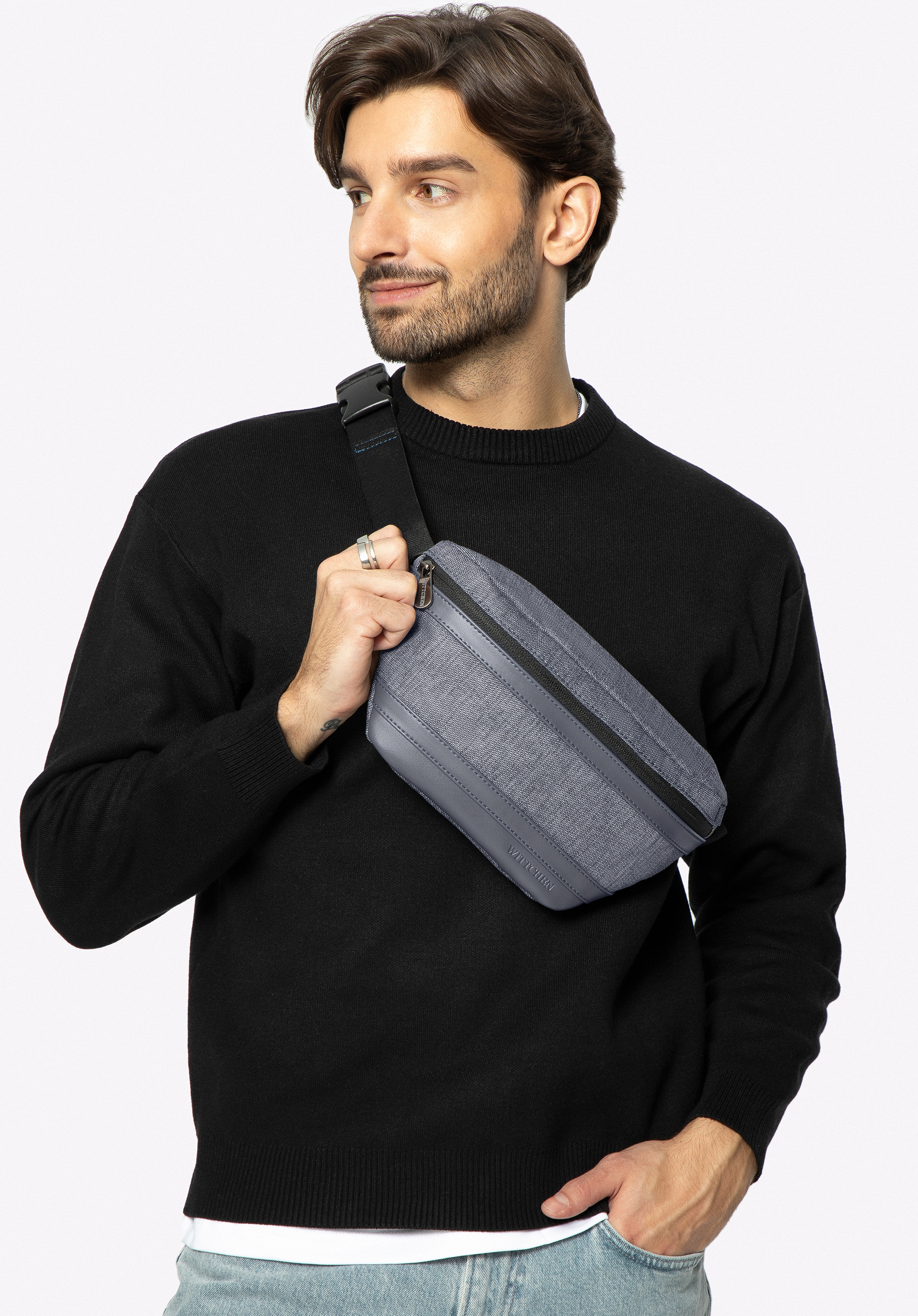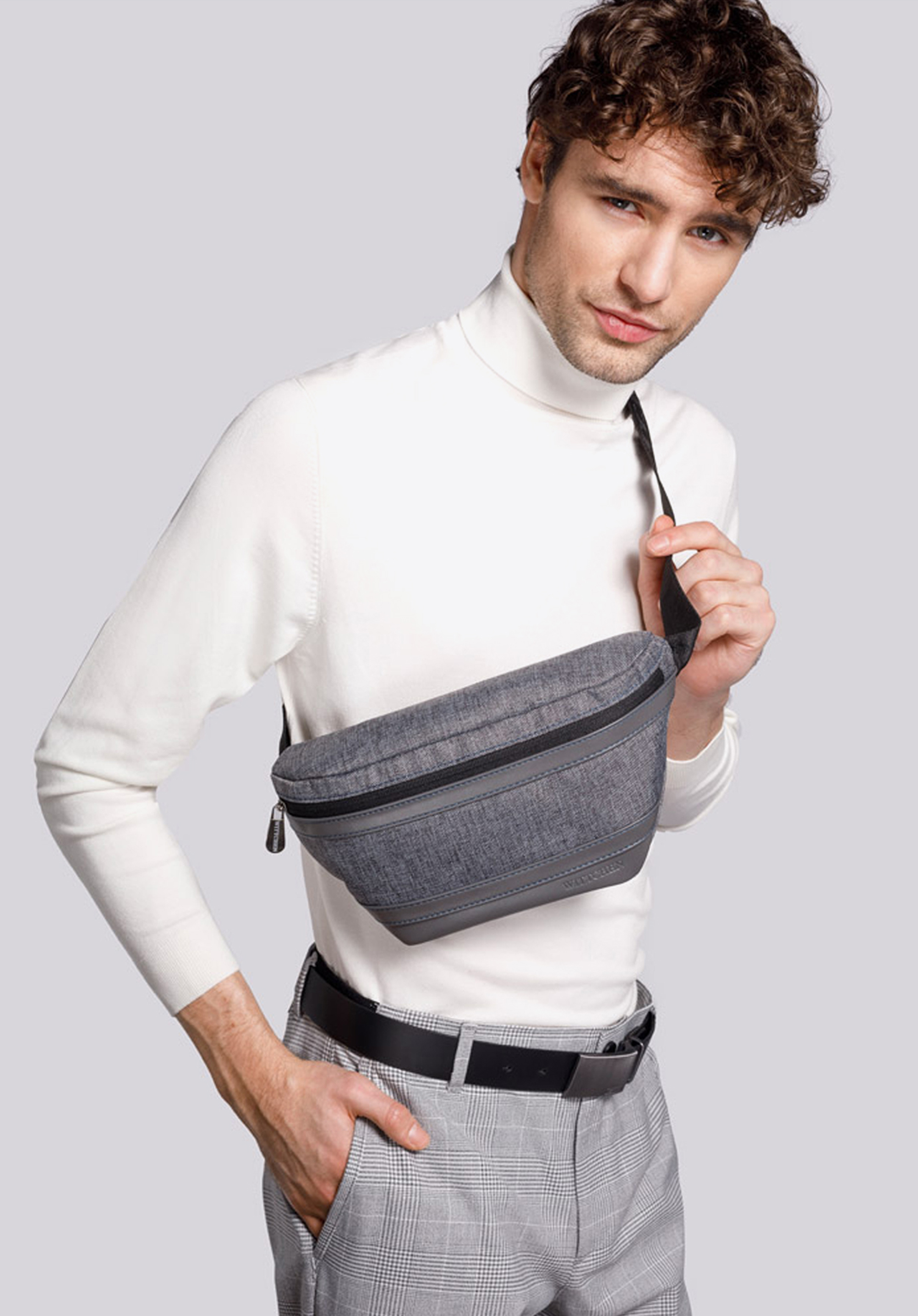 Tato ledvinka je nadčasovým a univerzálním doplňkem. Tento model je velmi prostorný. Vejde dovnitř peněženka, telefon a klíče. Uvnitř má praktickou kapsu na zip. Je vyrobena z odolného materiálů zdobeného vložkami z ekologické kůže.