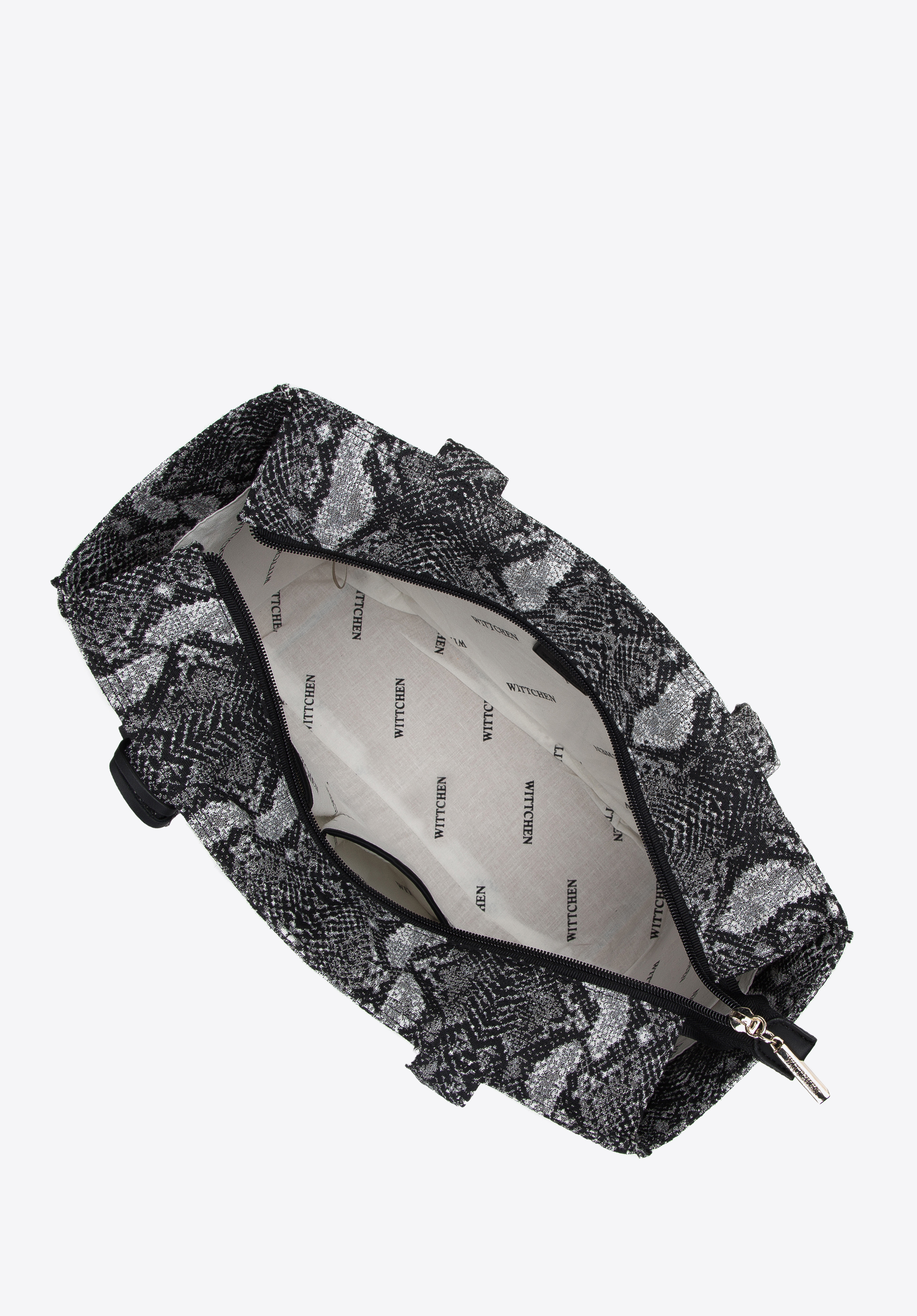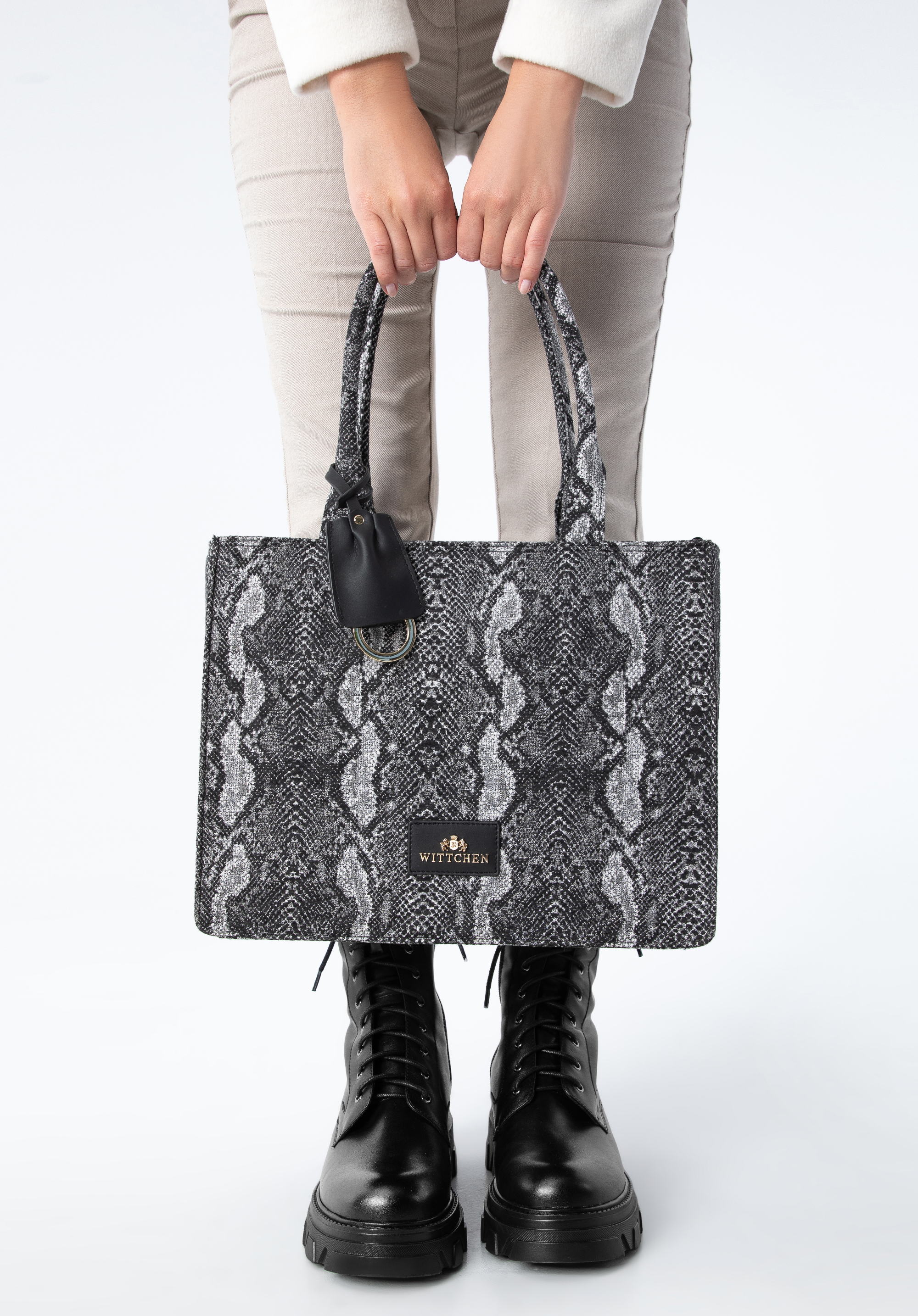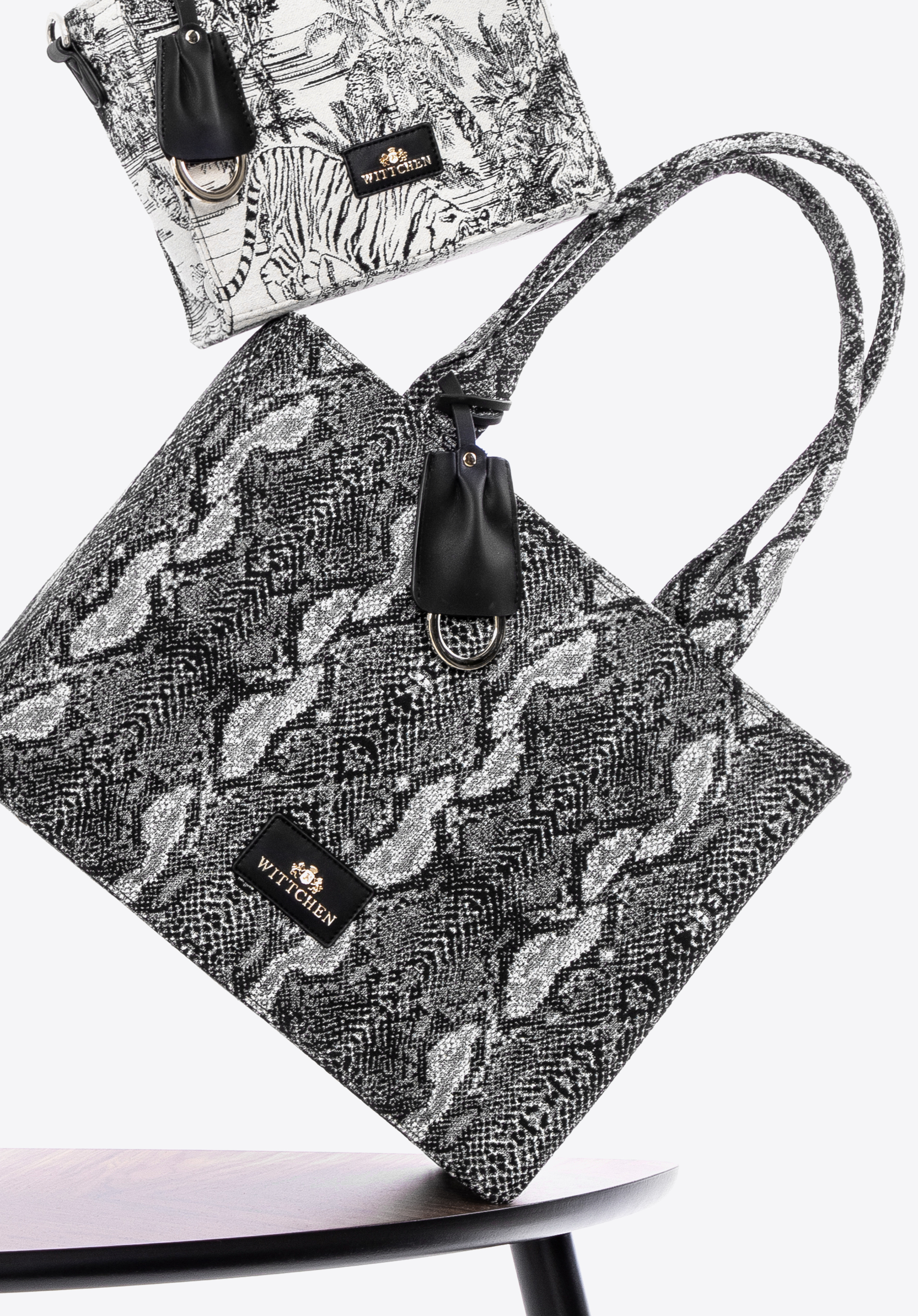 Tato stylová kabelka bude praktickým a módním každodenním doplňkem. Je vyrobena z bavlny s polyesterem a zlaté kování dodává lesk. Zvířecí vzor přitáhne mnoho pozornosti. Má vyztužený obdélníkový tvar, takže bude vypadat hezky bez ohledu na náplň. Můžete ji ho vzít do práce, na malý nákup nebo na víkendový výlet - je prostorná a stylová. Dovnitř vejdou dokumenty A4, malá kosmetická taška, kalendář a spousta dalších drobností. Vzorovaný model bude vypadat skvěle s hladkým klasickým oblekem. Kabelka se zvířecím motivem je skvělou volbou pro každého milovníka originálních potisků.