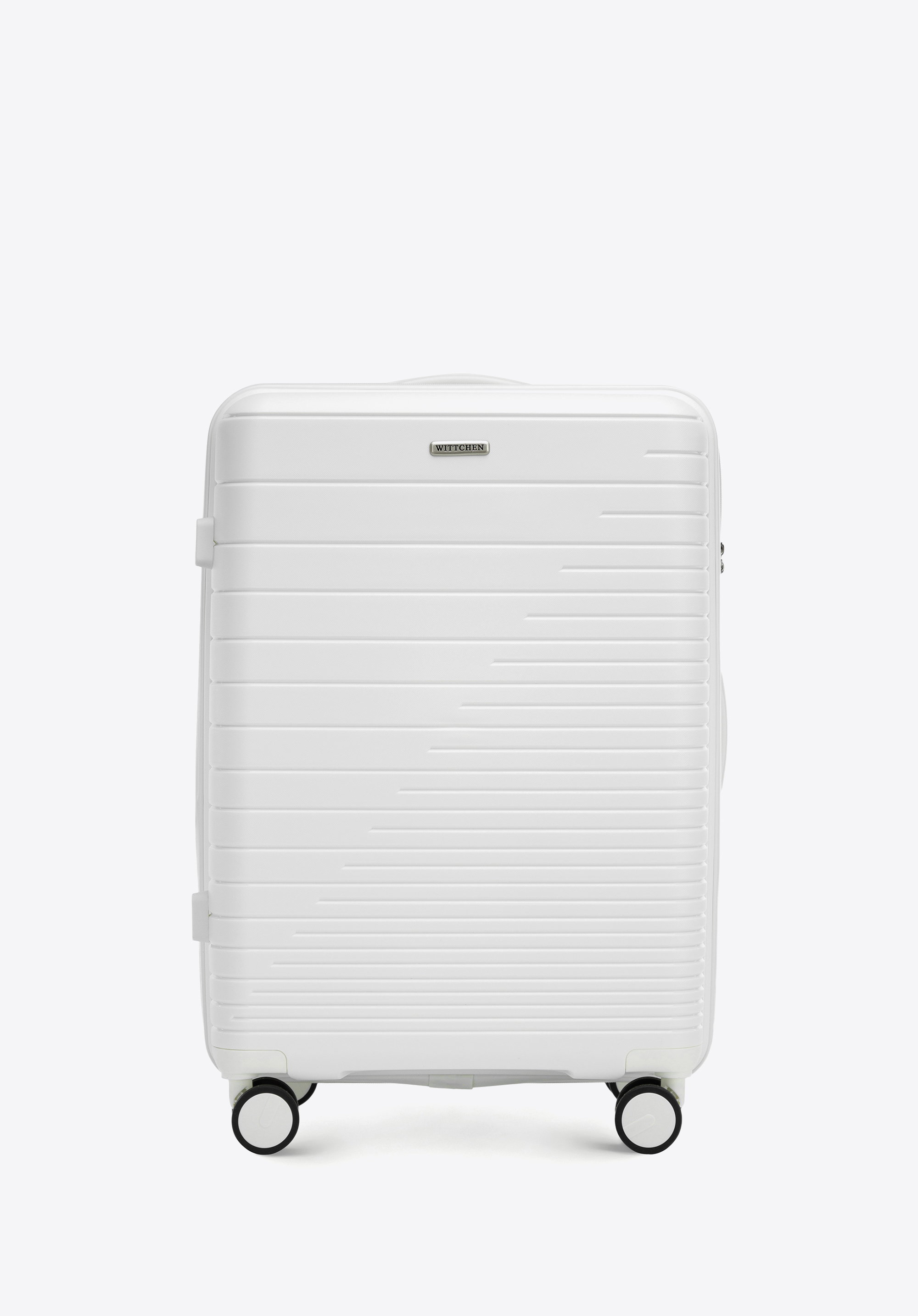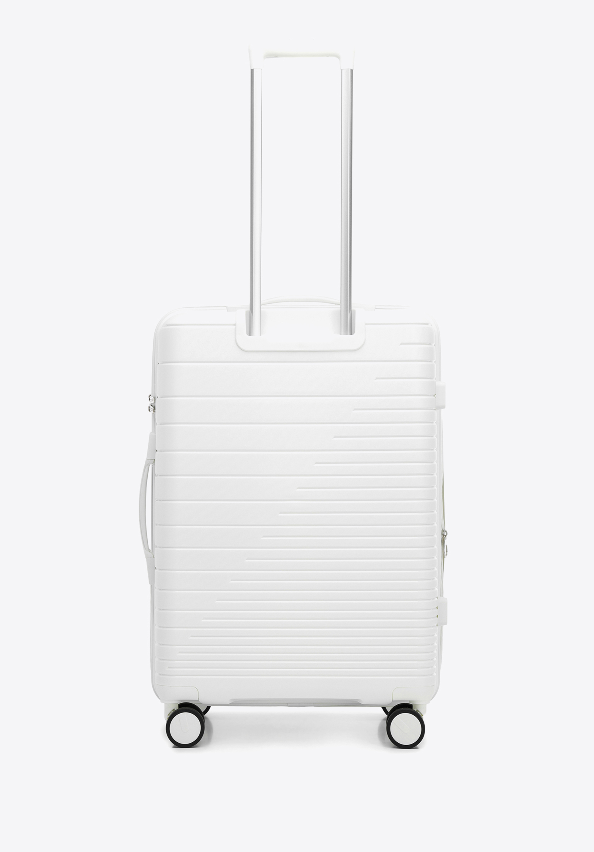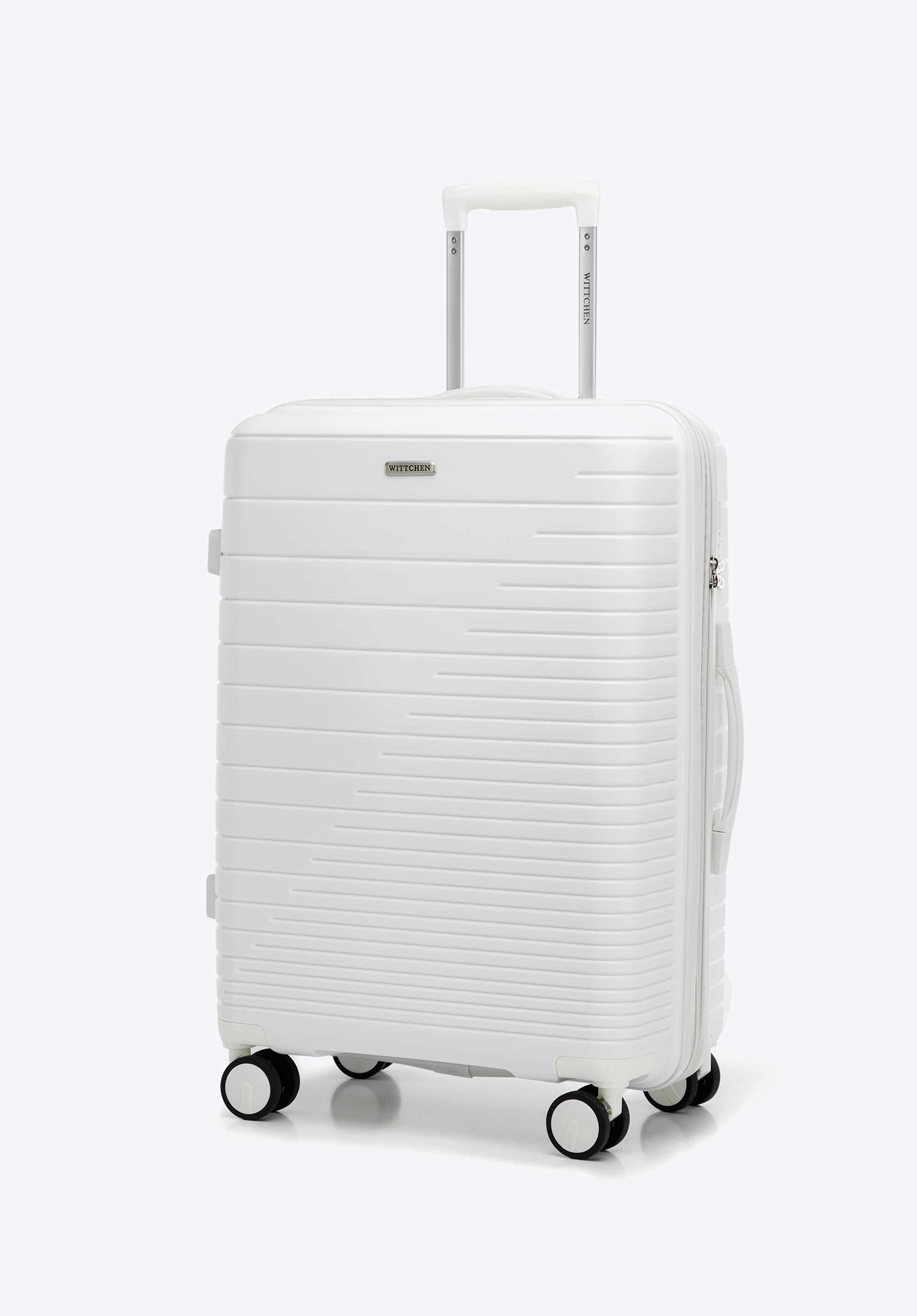 Tento střední velikosti kufr skvěle doplní každý váš výlet. Je praktický, stylový a je vybaven TSA zámkem, který zajistí bezpečnost obsahu. Je vyroben z kvalitního polypropylenu, takže se jedná o lehký a velmi elasticky model. Je obohacen lesklými vodorovnými pruhy, které dodávají celku moderní charakter. Uvnitř jsou dvě přehrádky, kam snadno zabalíte své věci a udržíte pořádek. Díky čtyřem dvojitým kolečkům a teleskopické rukojeti budete pohodlné cestovat. Střední kufr z polypropylenu s lesklými pruhy je skvělou volbou pro každého cestovatelského nadšence.