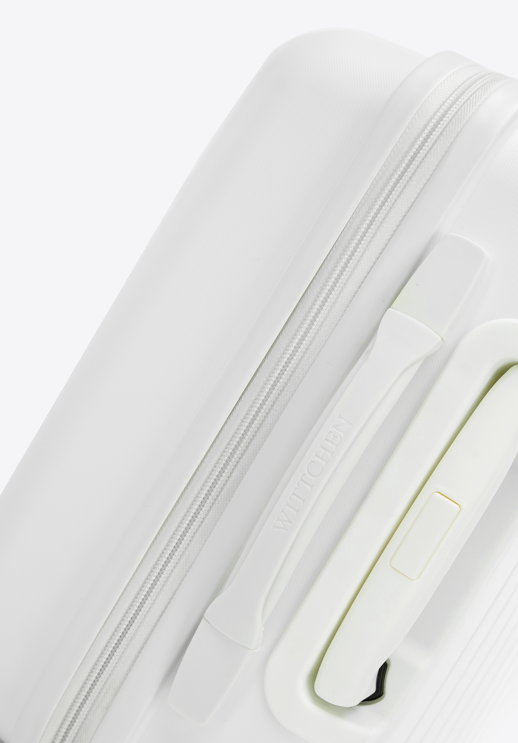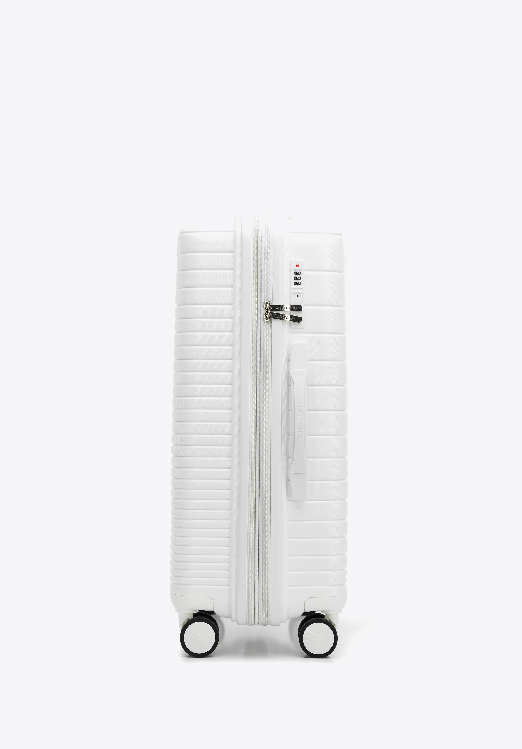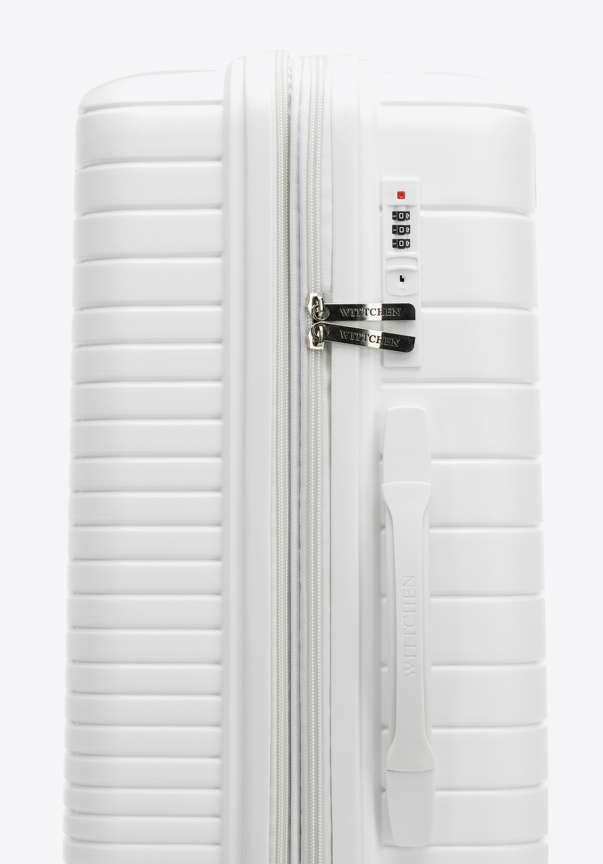 Tento střední velikosti kufr skvěle doplní každý váš výlet. Je praktický, stylový a je vybaven TSA zámkem, který zajistí bezpečnost obsahu. Je vyroben z kvalitního polypropylenu, takže se jedná o lehký a velmi elasticky model. Je obohacen lesklými vodorovnými pruhy, které dodávají celku moderní charakter. Uvnitř jsou dvě přehrádky, kam snadno zabalíte své věci a udržíte pořádek. Díky čtyřem dvojitým kolečkům a teleskopické rukojeti budete pohodlné cestovat. Střední kufr z polypropylenu s lesklými pruhy je skvělou volbou pro každého cestovatelského nadšence.