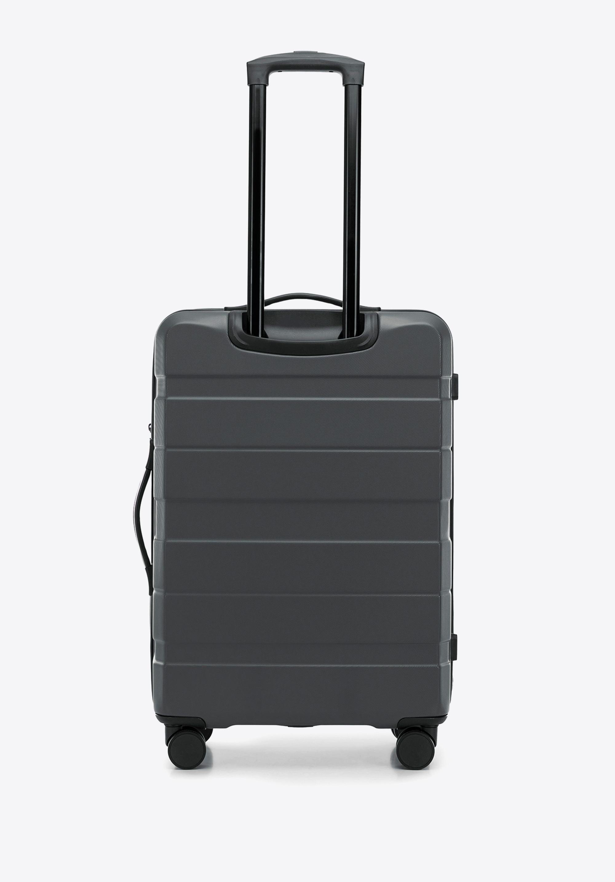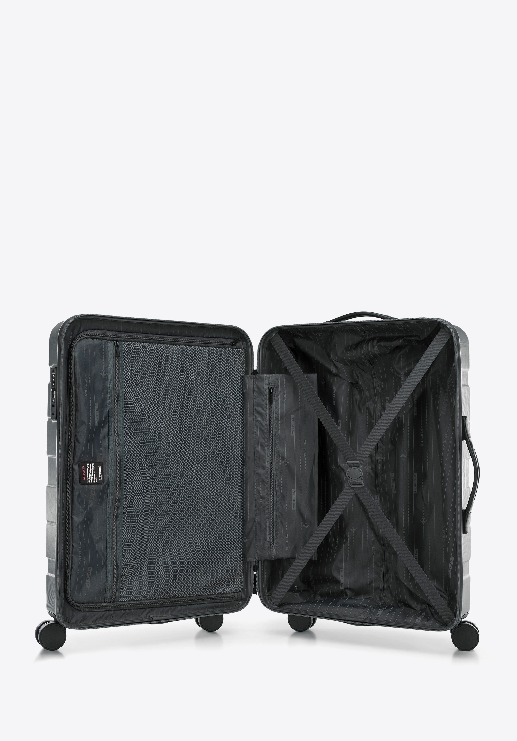 S tímto ABS kufrem budete cestovat pohodlně. Originální vzor konvexních a konkávních pruhů dodává mu moderní charakter. Střední kufr z kolekce COMODO Line je poměrně prostorný, takže se do něj snadno vejdou věci na dovolenou. Přihrádka s elastickými popruhy zabrání posouvání oblečení a vnitřní kapsy udrží vaše drobnosti uspořádané. Díky čtyřem dvojitým kolům bude se snadno s nim manévrovat. Střední kufr s vodorovnými pruhy je skvělou volbou, která zvýrazní jakýkoli váš styl.