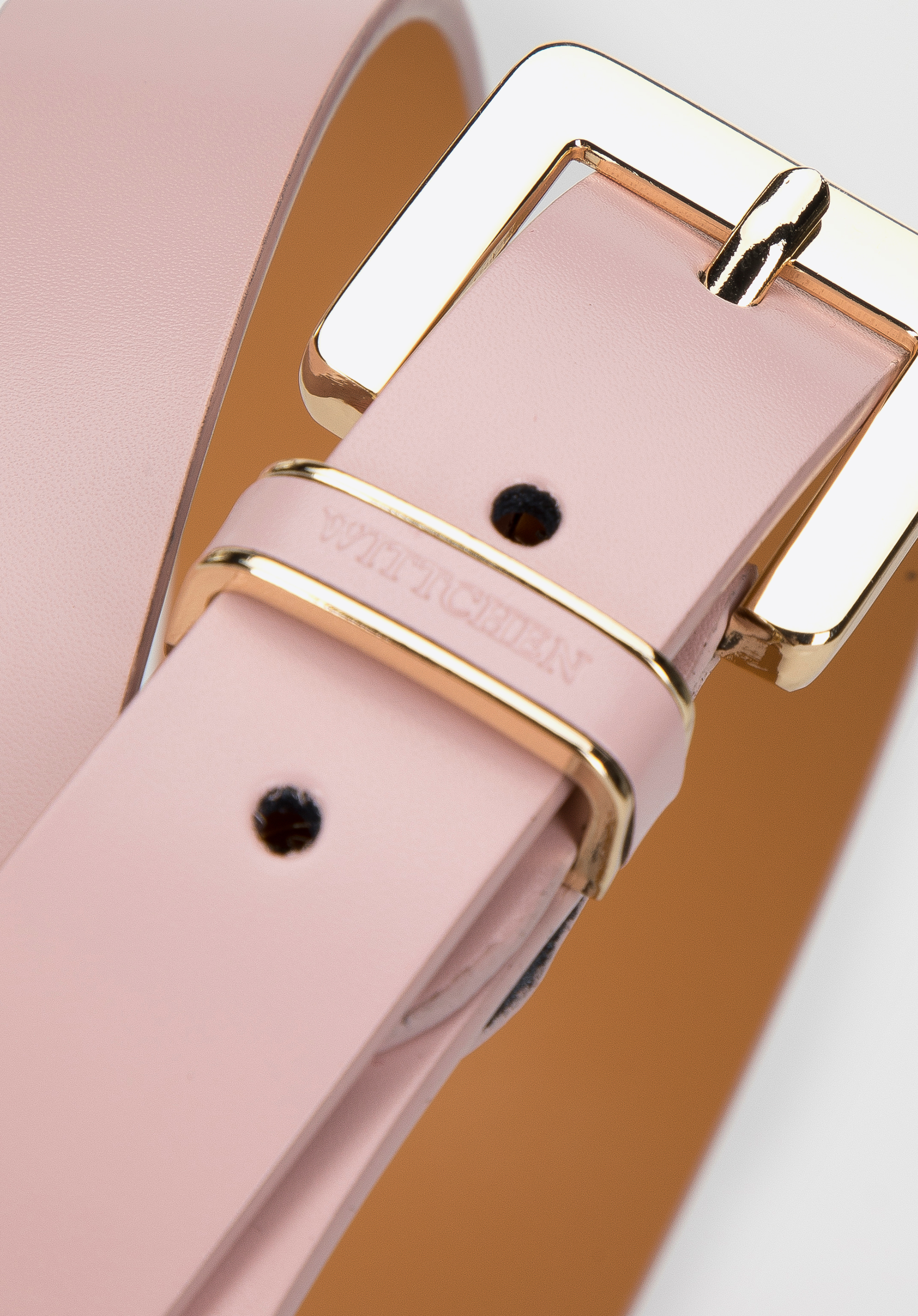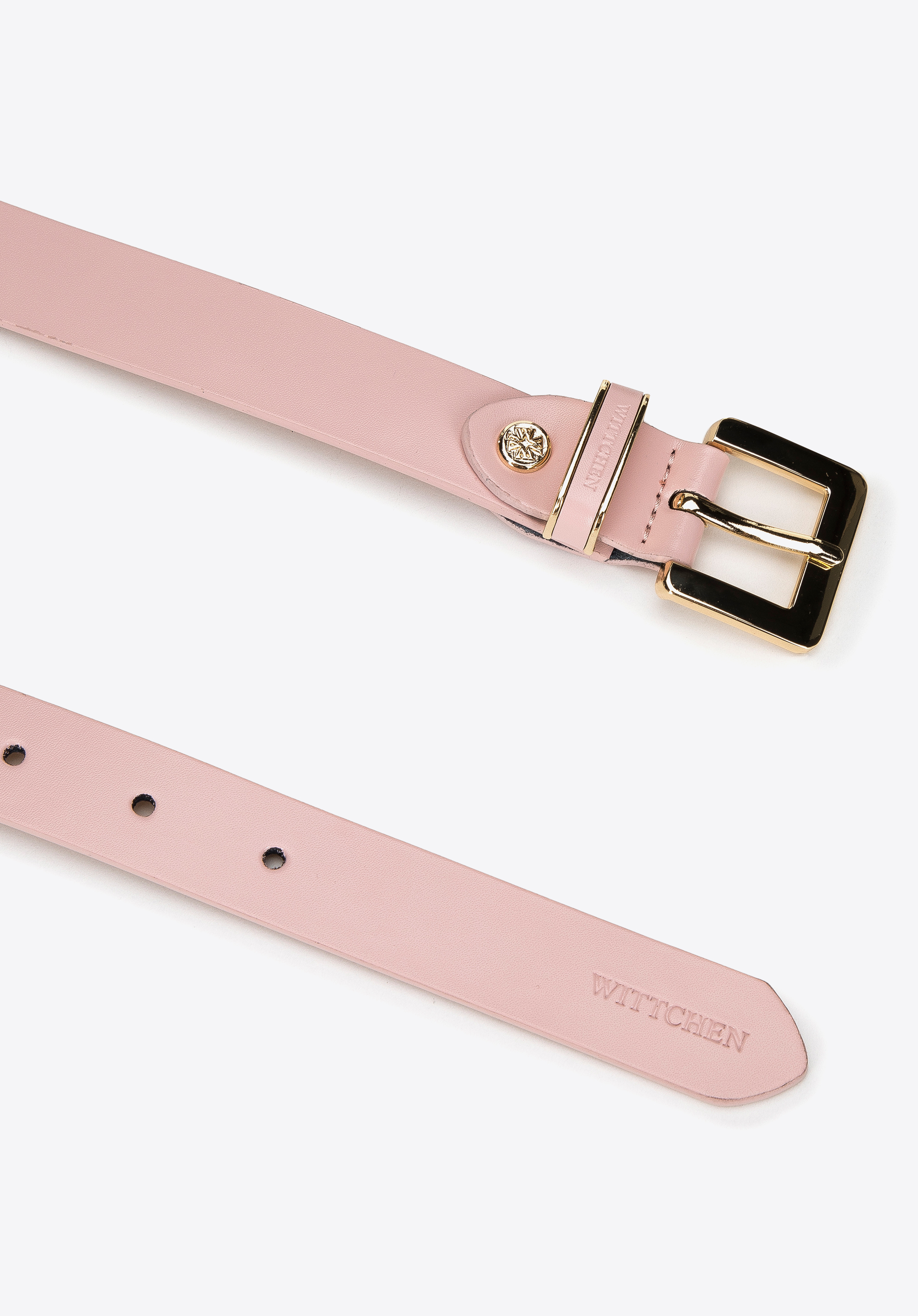 Tento stylový dámský pásek nesmí chybět v šatníku každé ženy. Je vyroben z vysoce kvalitní přírodní kůže. Zdobí ho lesklá, geometrická spona s hladkým povrchem. Celek doplňuje kovové poutko z lemované kůže, s lesklými boky a vyraženým logem WITTCHEN. Můžete ho nosit jak ke svým oblíbeným kalhotám a košili, tak k elegantním šatům. Úzký dámský kožený pásek s ozdobným poutkem je nadčasovým doplňkem, který bude se hodit při mnoha příležitostech.