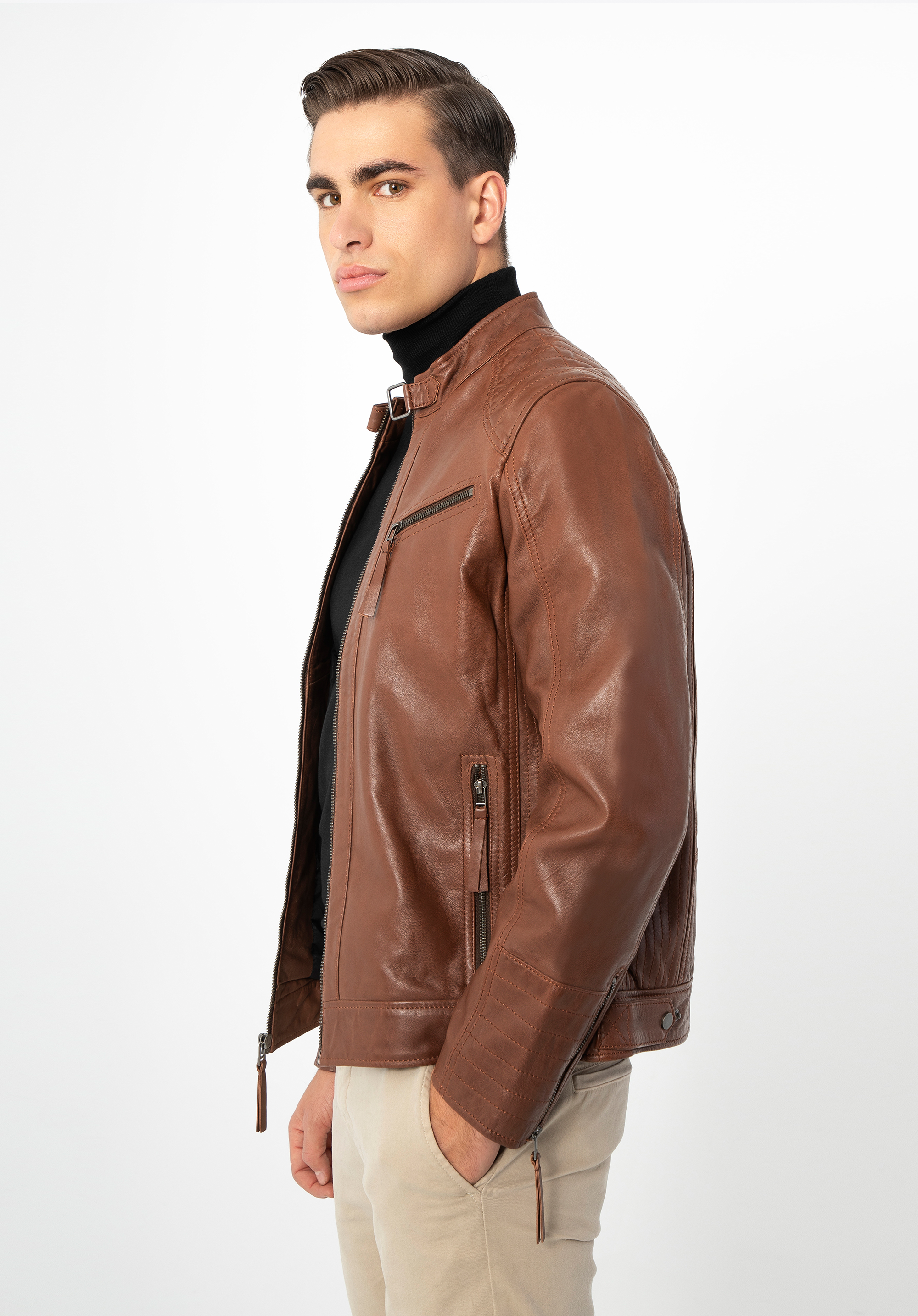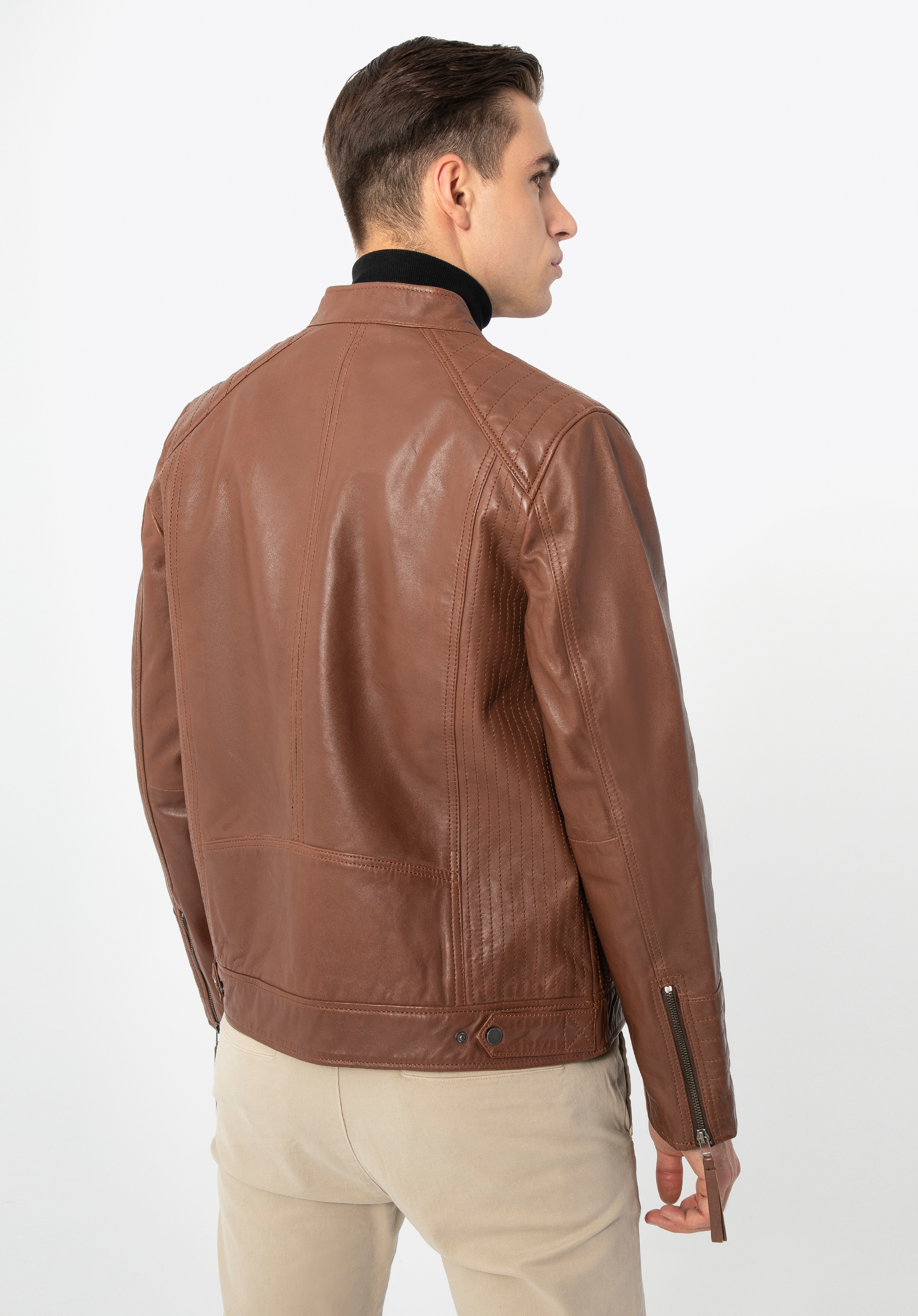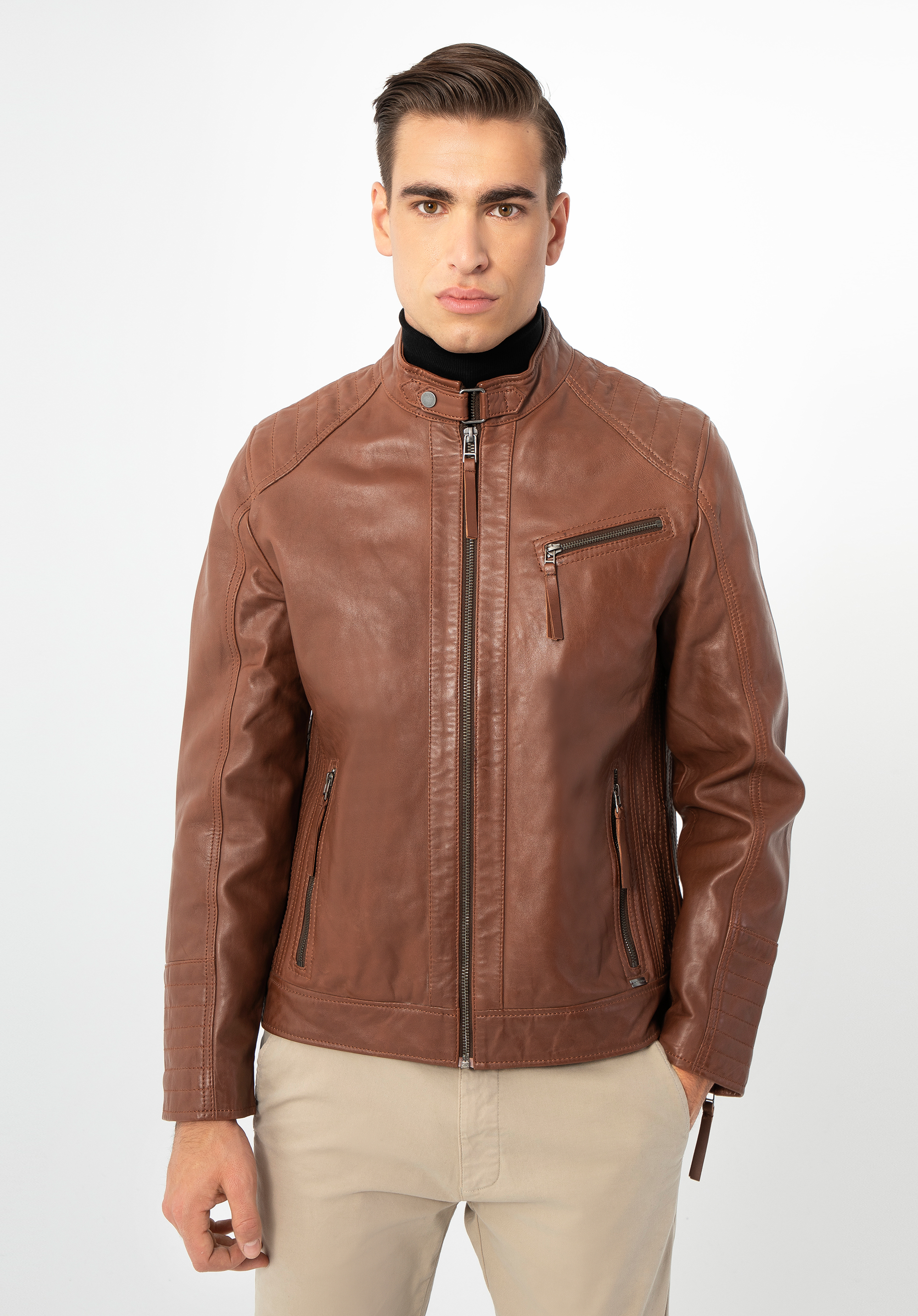 Tato stylová bunda je skvělou volbou pro každodenní nošení. Efektní stojáček zapínaný páskem s patentkou dává elegantní charakter. Díky patentkám v úrovni boků můžete si ji snadno přizpůsobit svému střihu. Svislé švy na zádech zeštíhlí postavu a ozdobné prošívání pěkně ji zvýrazní. Tento model je vyroben z vysoce kvalitní přírodní kůže, takže je doplňkem na mnoho sezón. Dokonale zdůrazní každodenní oblek. Pánská kožená bunda s vertikálním prošíváním a stojáčkem bude se hodit na mnoho let.