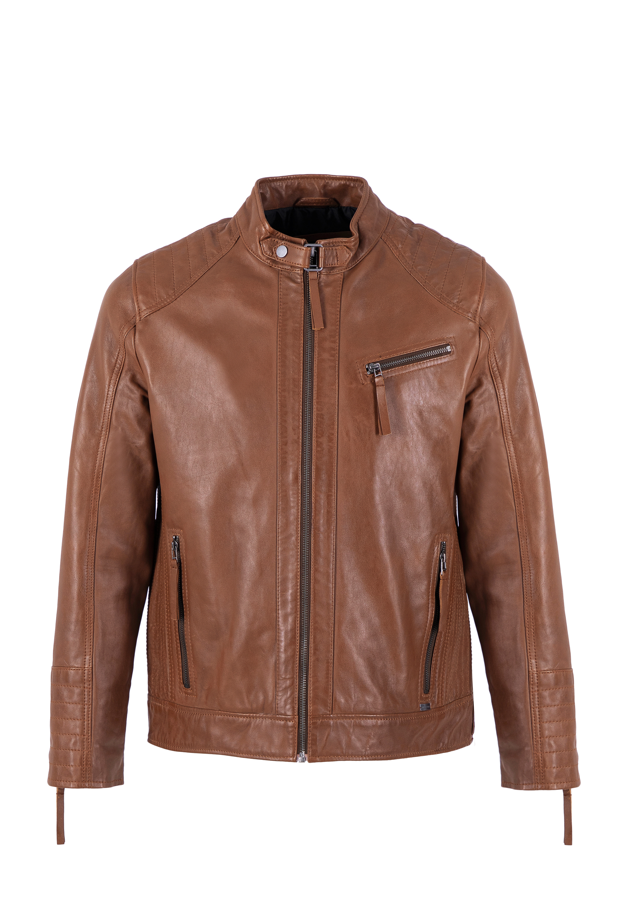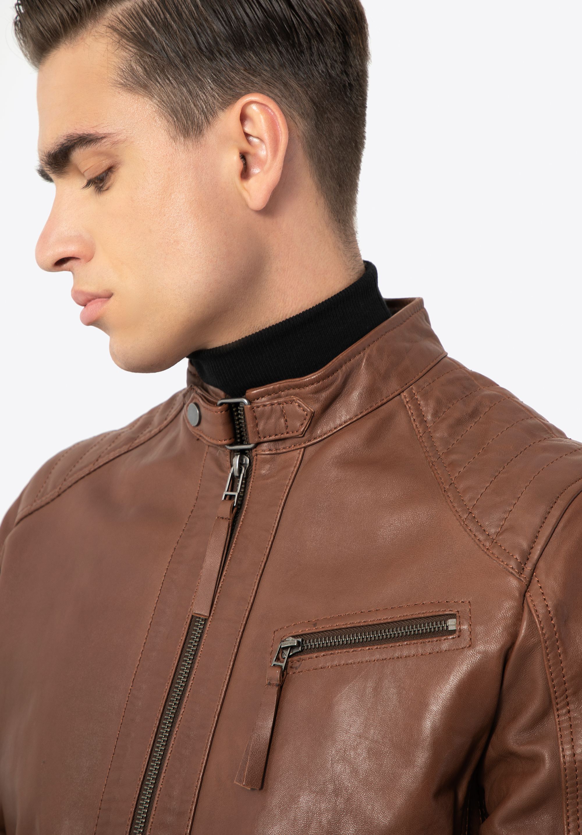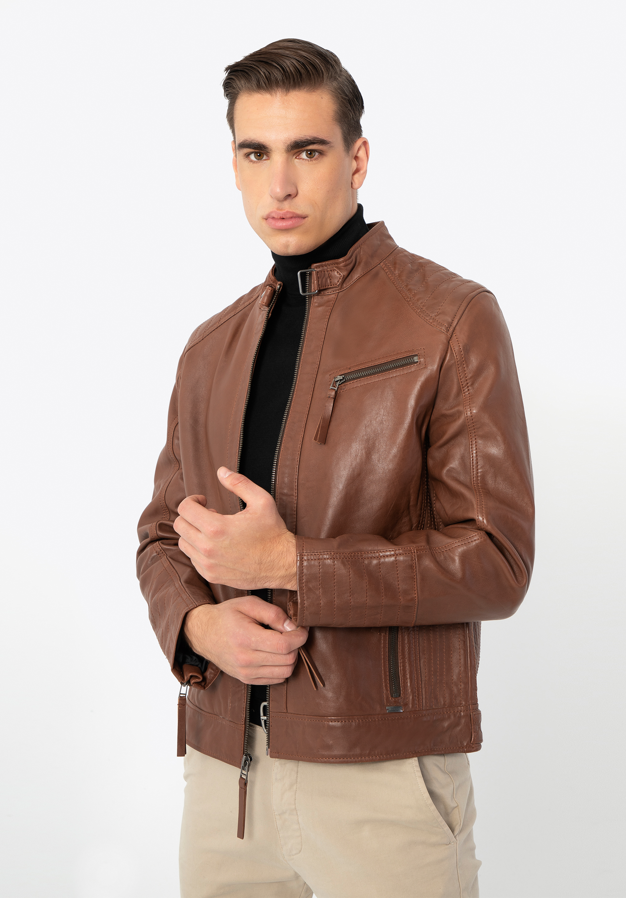 Tato stylová bunda je skvělou volbou pro každodenní nošení. Efektní stojáček zapínaný páskem s patentkou dává elegantní charakter. Díky patentkám v úrovni boků můžete si ji snadno přizpůsobit svému střihu. Svislé švy na zádech zeštíhlí postavu a ozdobné prošívání pěkně ji zvýrazní. Tento model je vyroben z vysoce kvalitní přírodní kůže, takže je doplňkem na mnoho sezón. Dokonale zdůrazní každodenní oblek. Pánská kožená bunda s vertikálním prošíváním a stojáčkem bude se hodit na mnoho let.