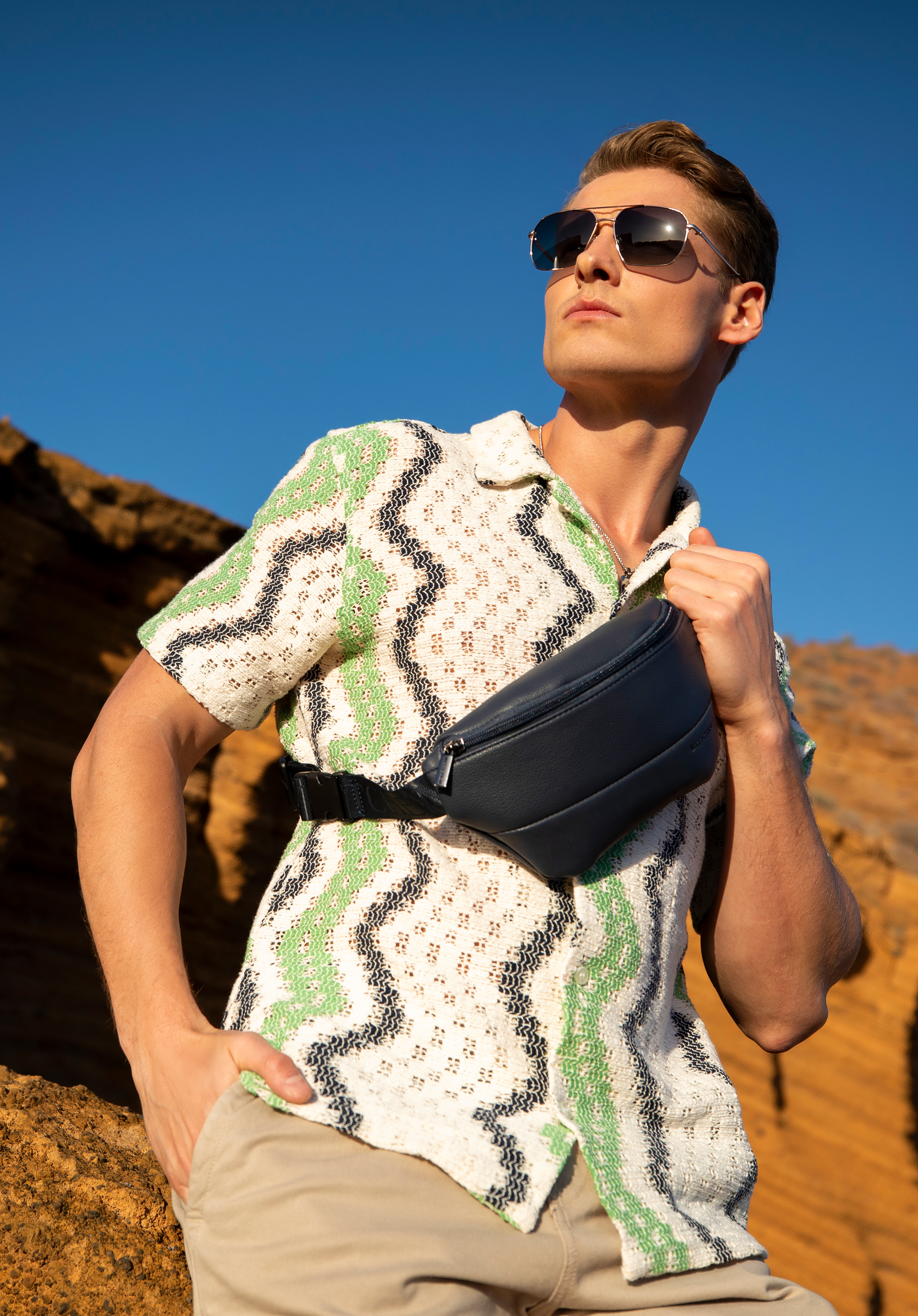 Tato malá pánská ledvinka s jednoduchými minimalistickými liniemi bude se hodit k mnoha typům oblečení: od elegantních kalhot s košilí až po teplákovou soupravu. Ledvinka velmi pohodlně se nosí. Můžete ji přehodit přes rameno, zapnout v pase nebo na bocích. Dovnitř vejdou nejnutnější věci, například: telefon, sluchátka a peněženka. Pozornost upoutá kombinace dvou druhů ekologické kůže ve stejné barvě, ale s odlišnou povrchovou úpravou: matnou a zrnitou. Minimalistická pánská ledvinka je praktickým, ale i stylovým doplňkem pro každodenní nošeni.